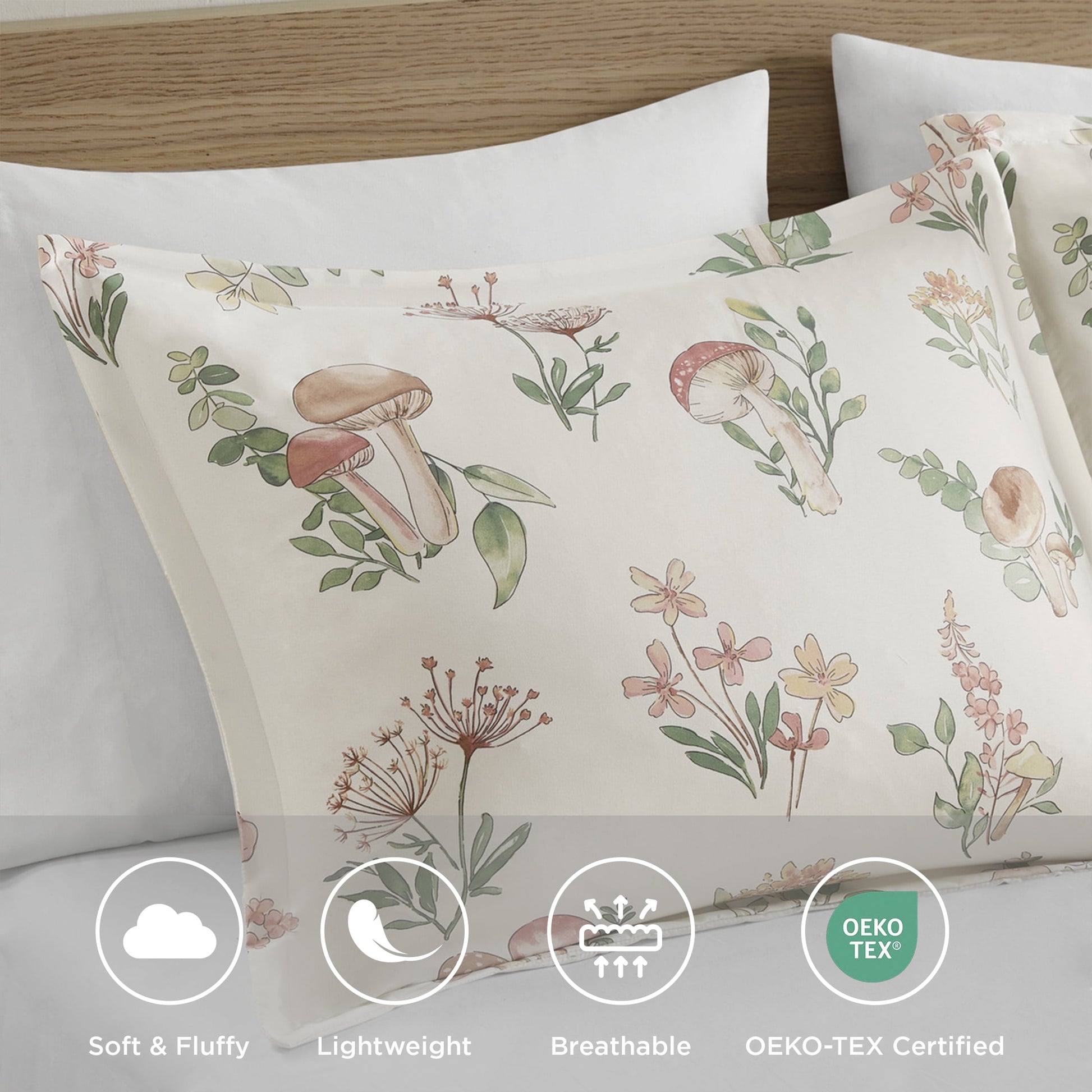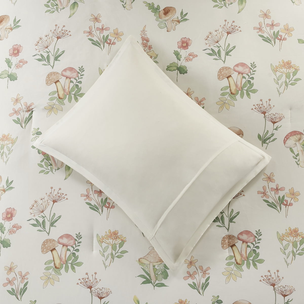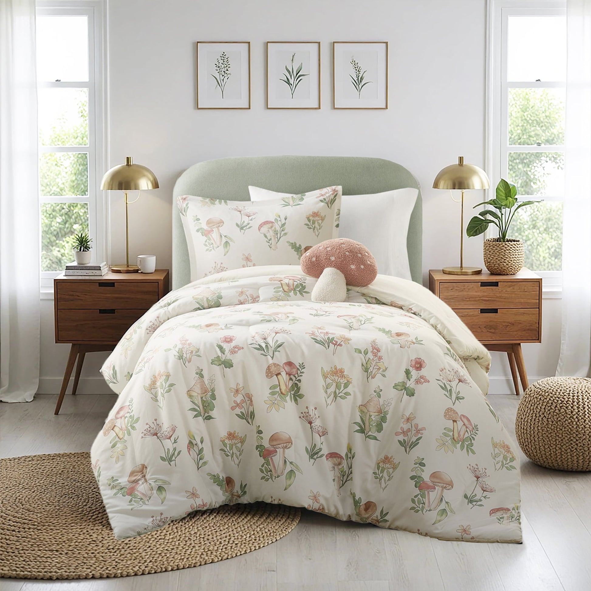 Add an enchanting update to your bedroom with this mushroom and floral comforter set. Matching shams (1 in Twin/Twin XL) coordinate with the whimsical comforter, while a cute mushroom shaped pillow provides a fun and playful detail. The comforter and pillows are filled with hypoallergenic polyester that contains no allergens and are dust proof, so you can sleep comfortably. This machine washable bedding set is OEKO-TEX certified and also has an added treatment that inhibits bacteria growth to keep the bedding fresher for longer.