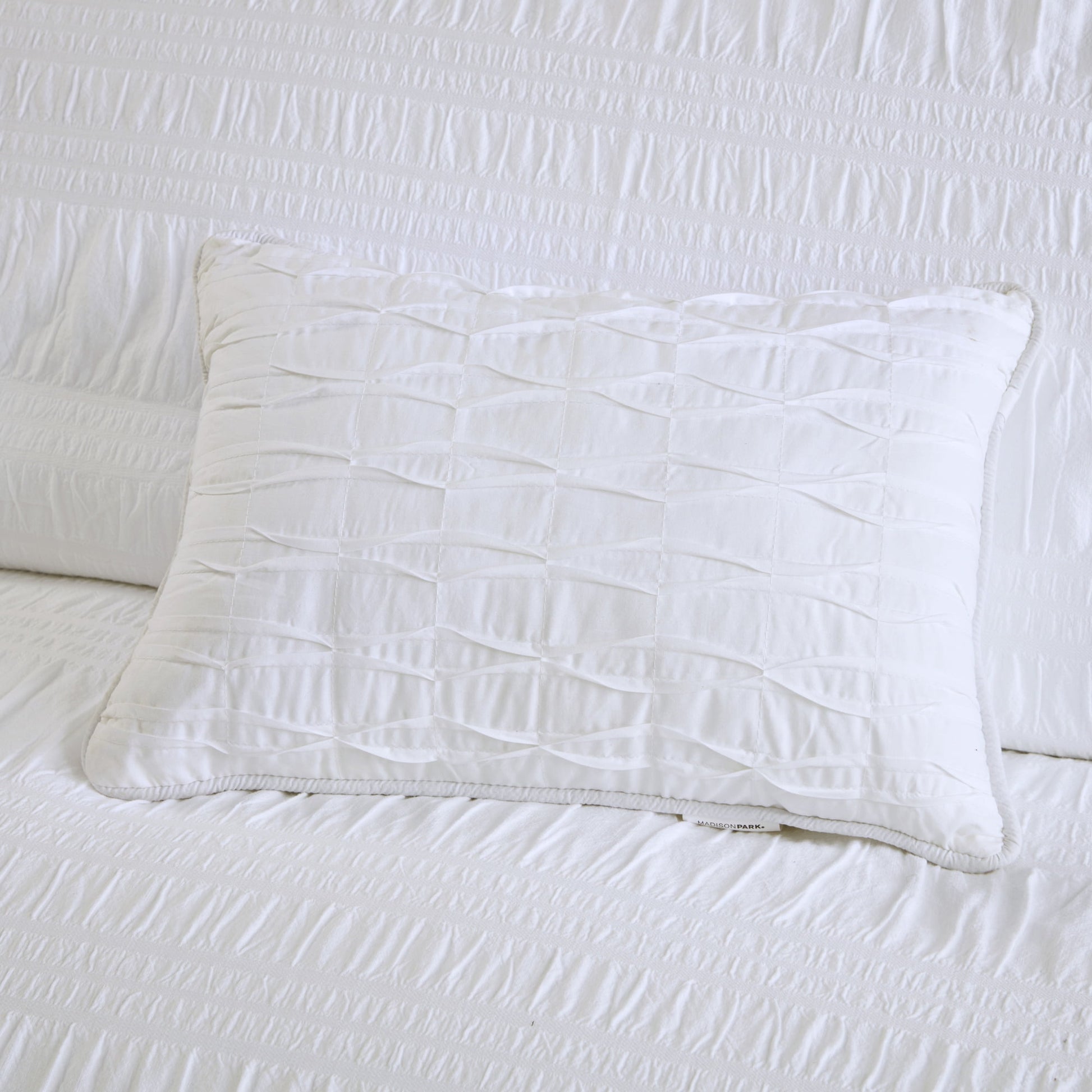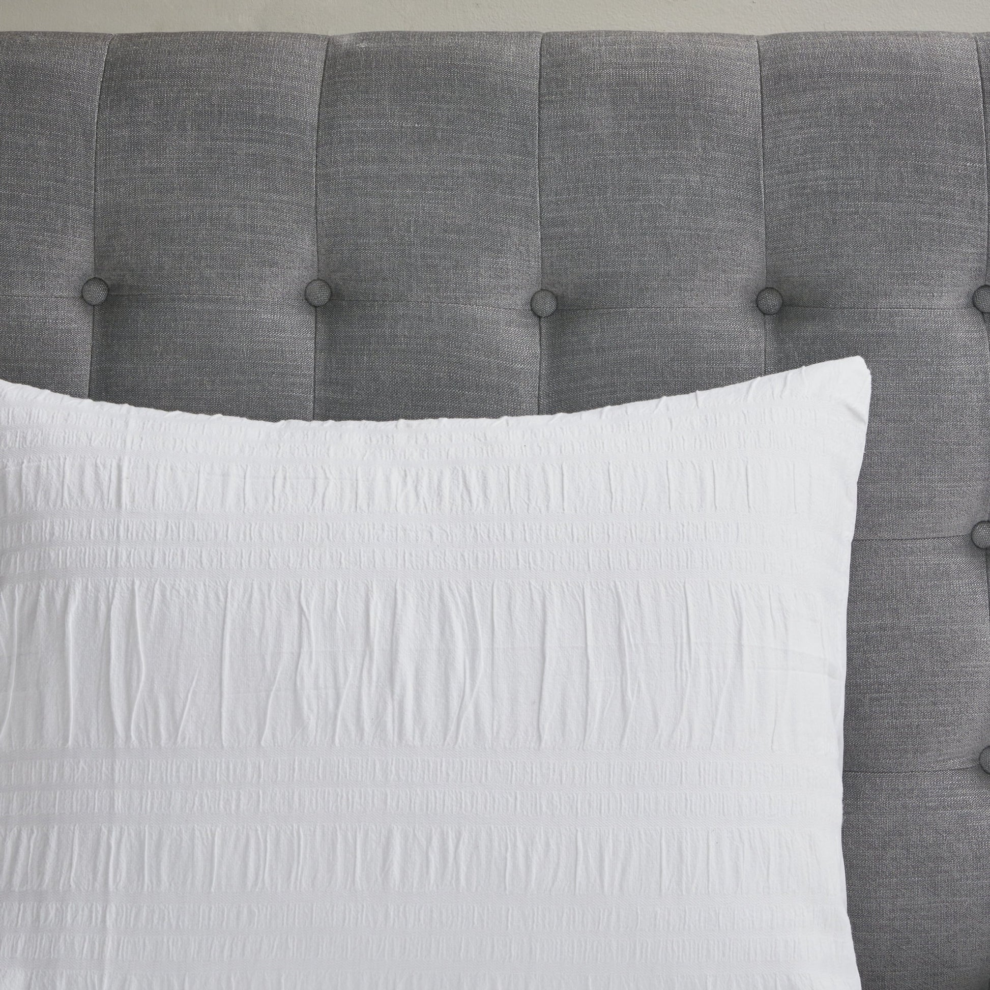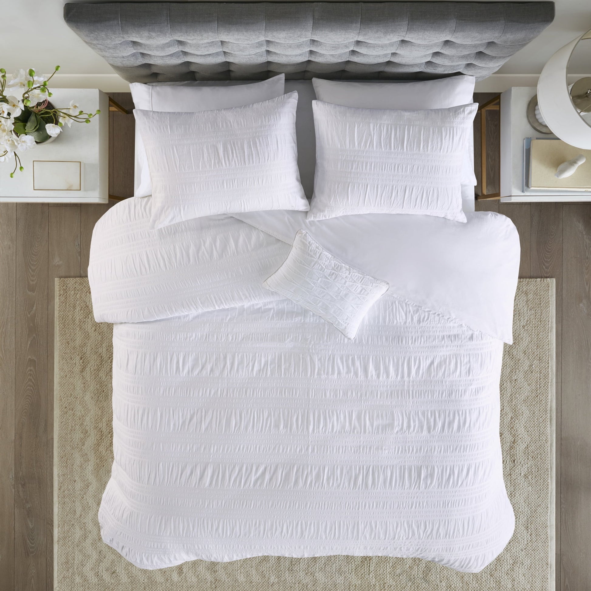 The Madison Park Nicolette 4 Piece Duvet Cover Set turns your bedroom into a cozy getaway. This seersucker duvet cover showcases a simple, yet intricate striped pattern in an elegant white hue. The textured fabric is light and soft to the touch, adding freshness and dimension to the bed. Matching shams echo the style of the duvet cover, while a decorative pillow helps complete the entire ensemble. Made from 100% cotton, this duvet cover set is machine washable for easy care.
