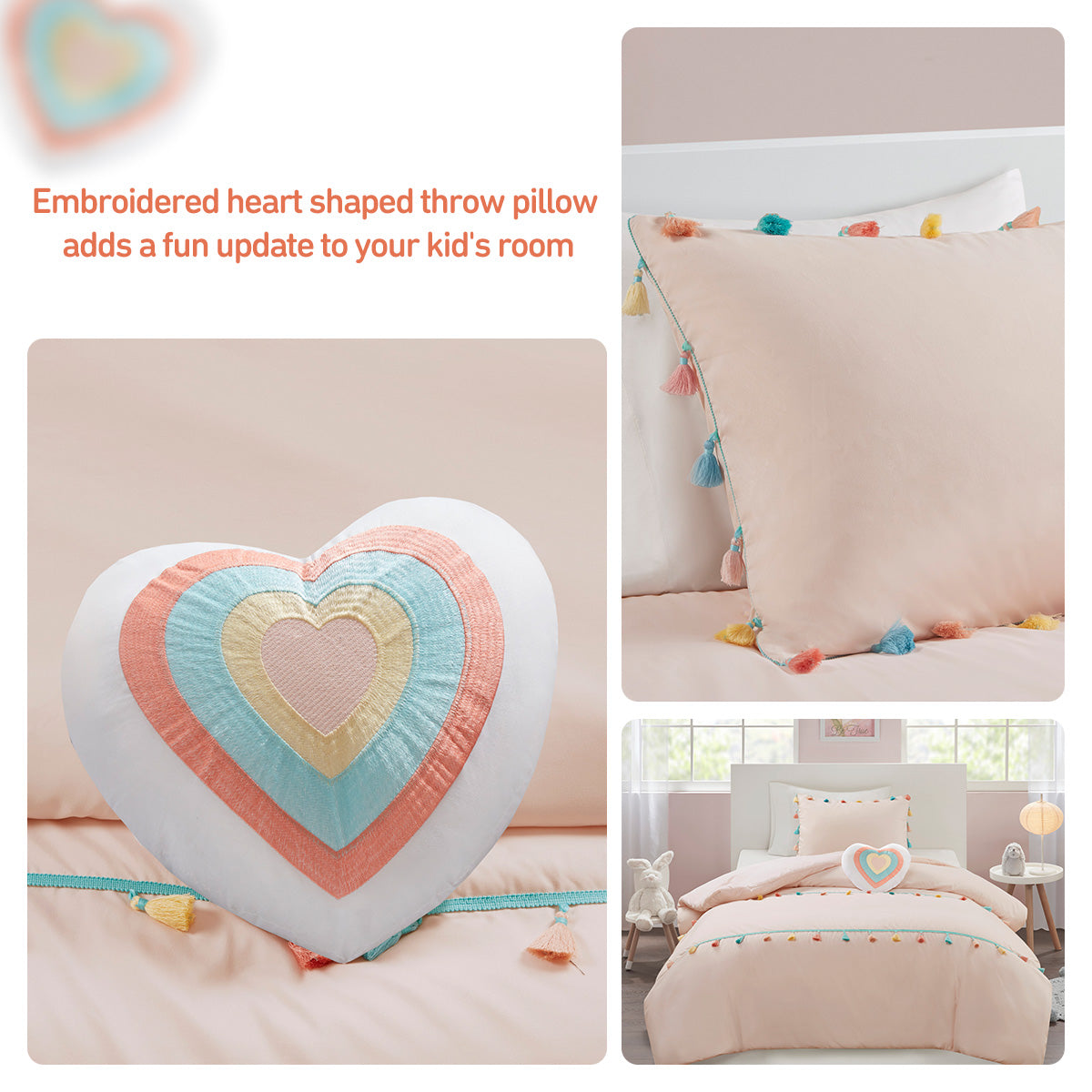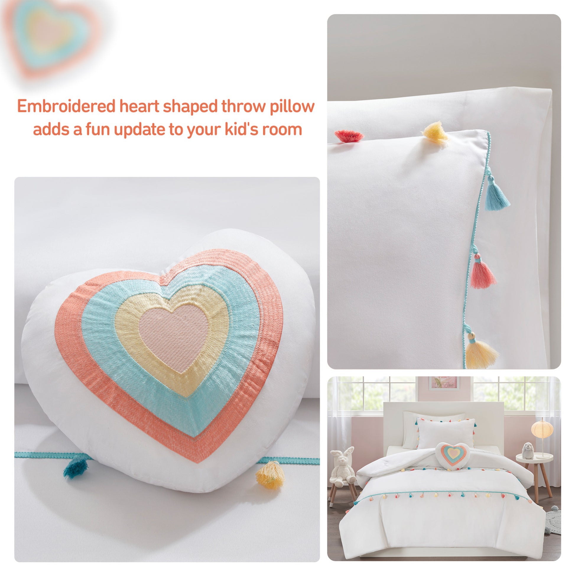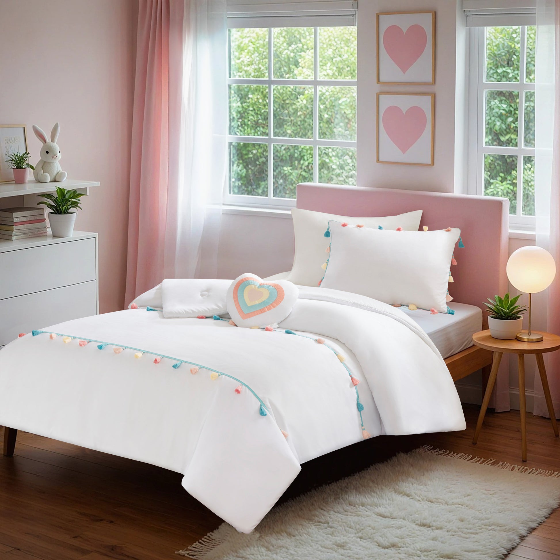 4 Piece Colorful Tassel Kid's Bedding Set, Comforter Set with Heart Shaped Throw Pillow