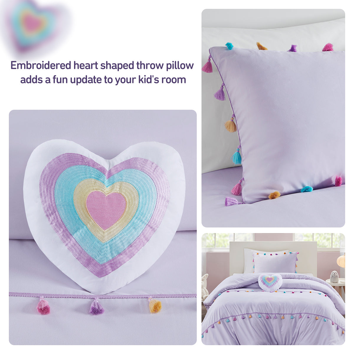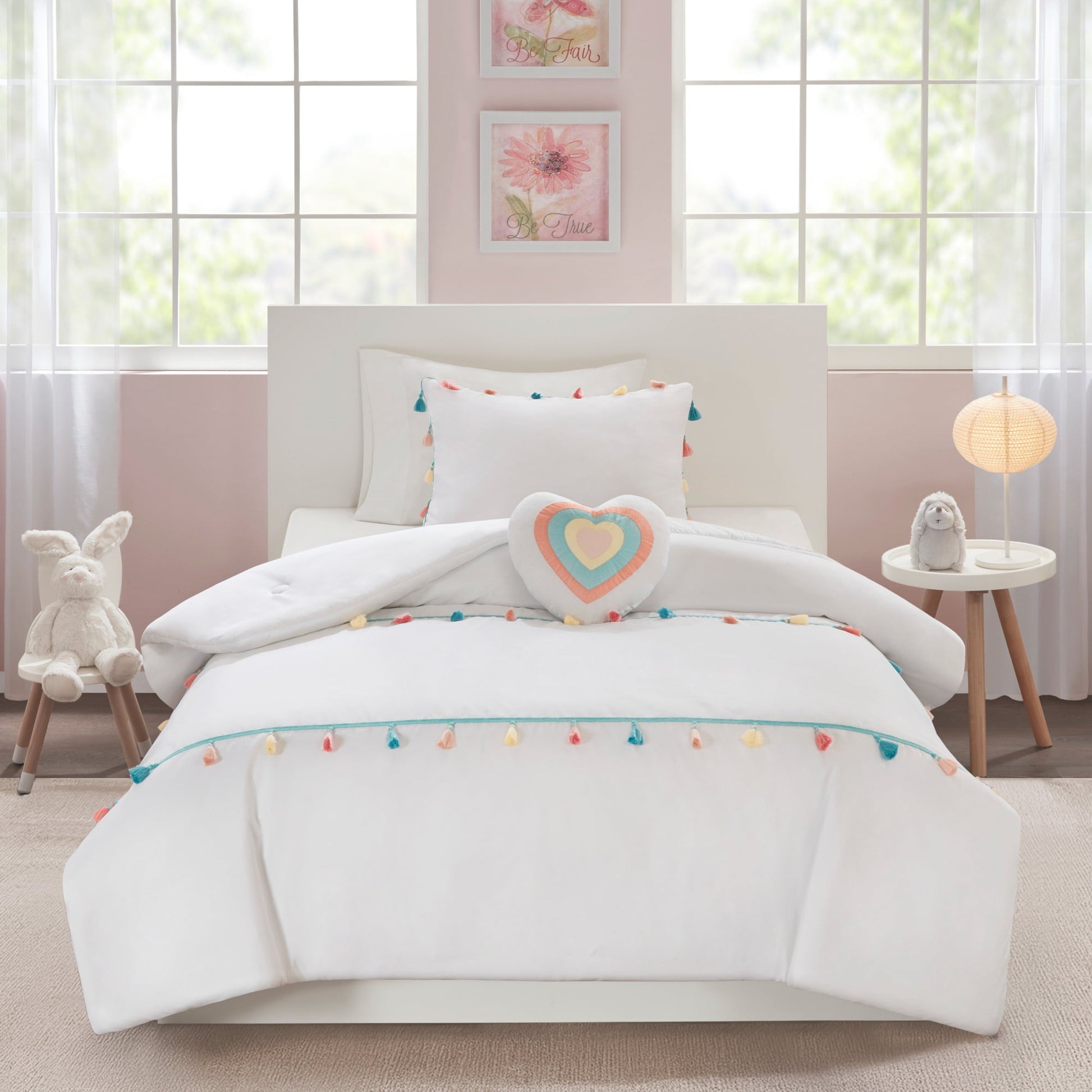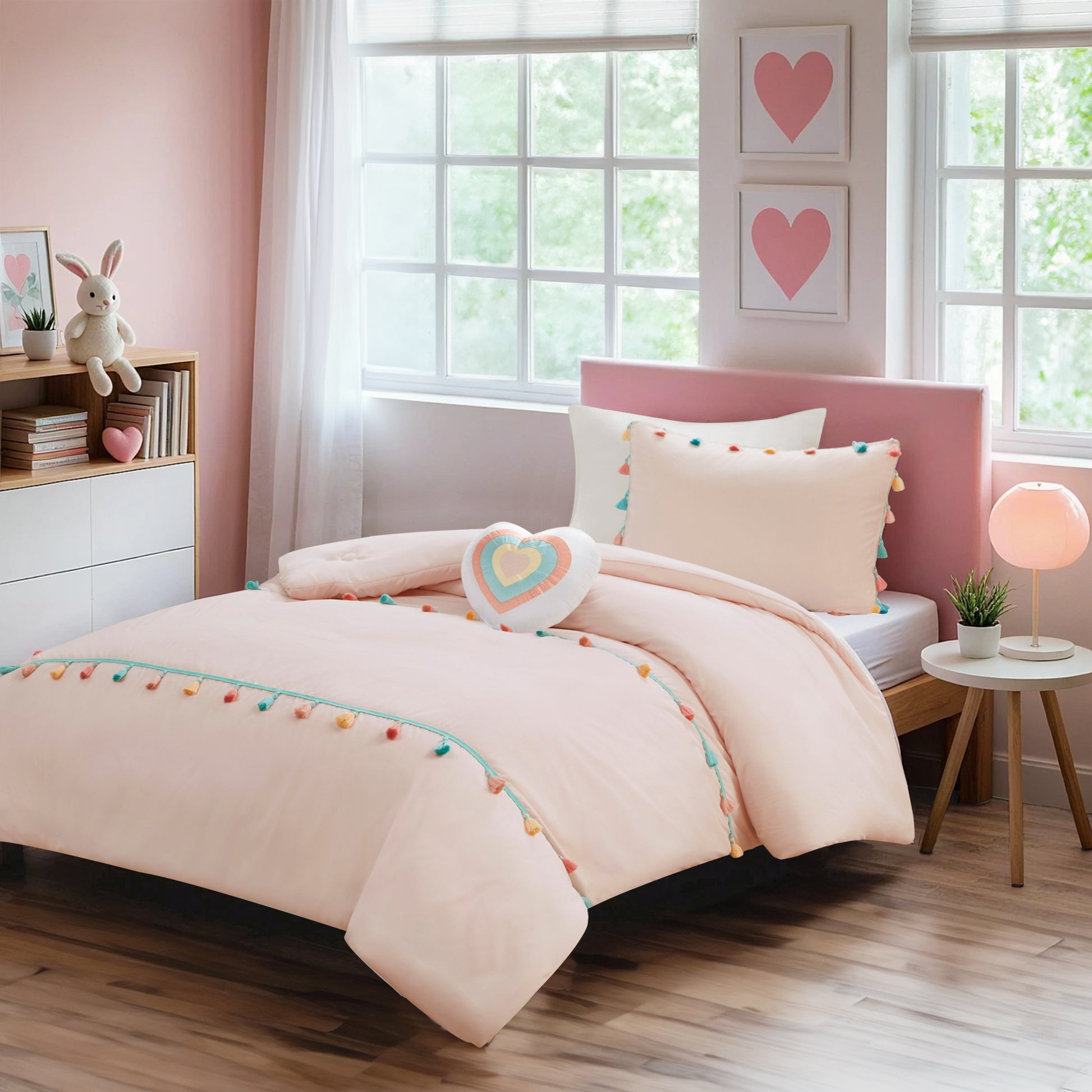 4 Piece Colorful Tassel Kid's Bedding Set, Comforter Set with Heart Shaped Throw Pillow