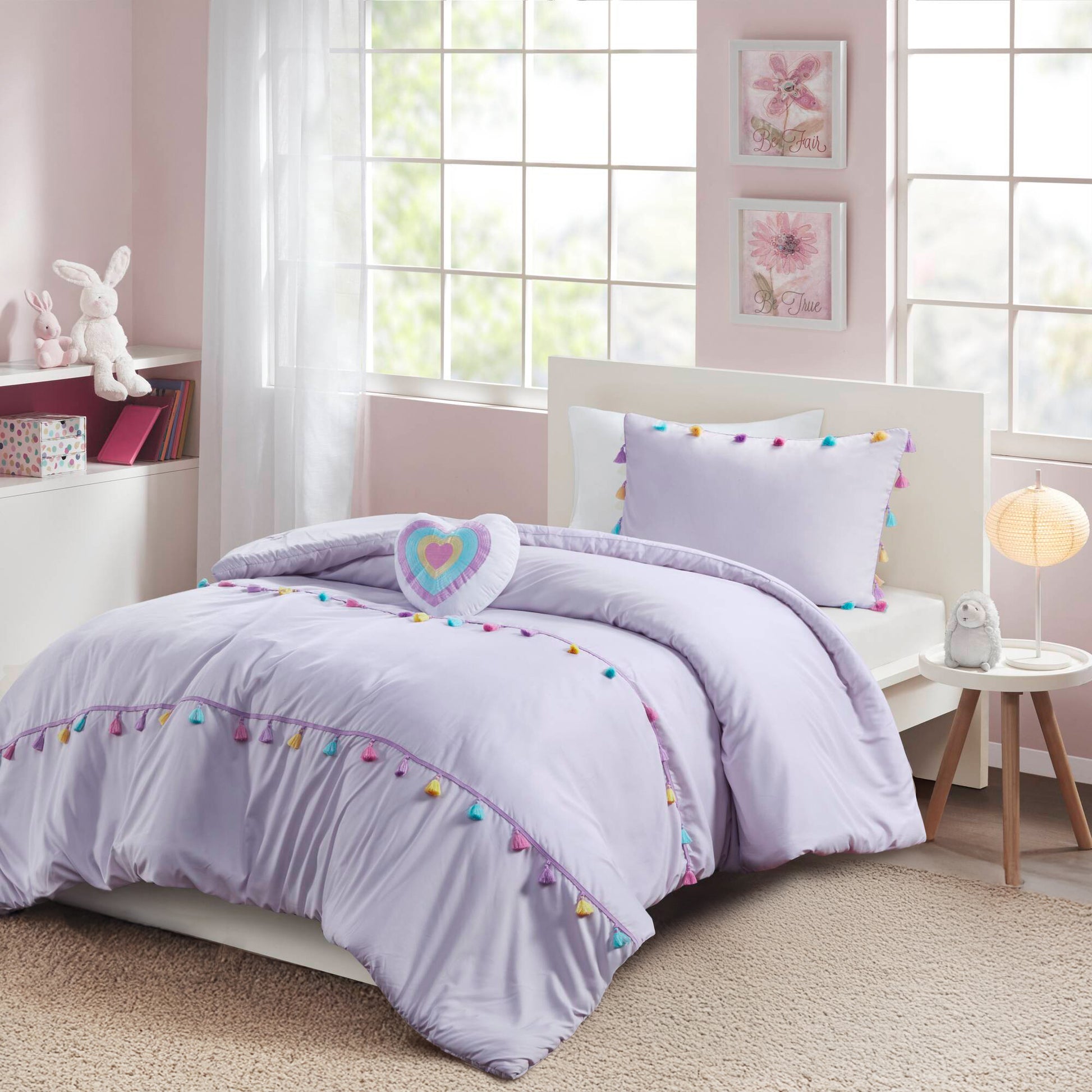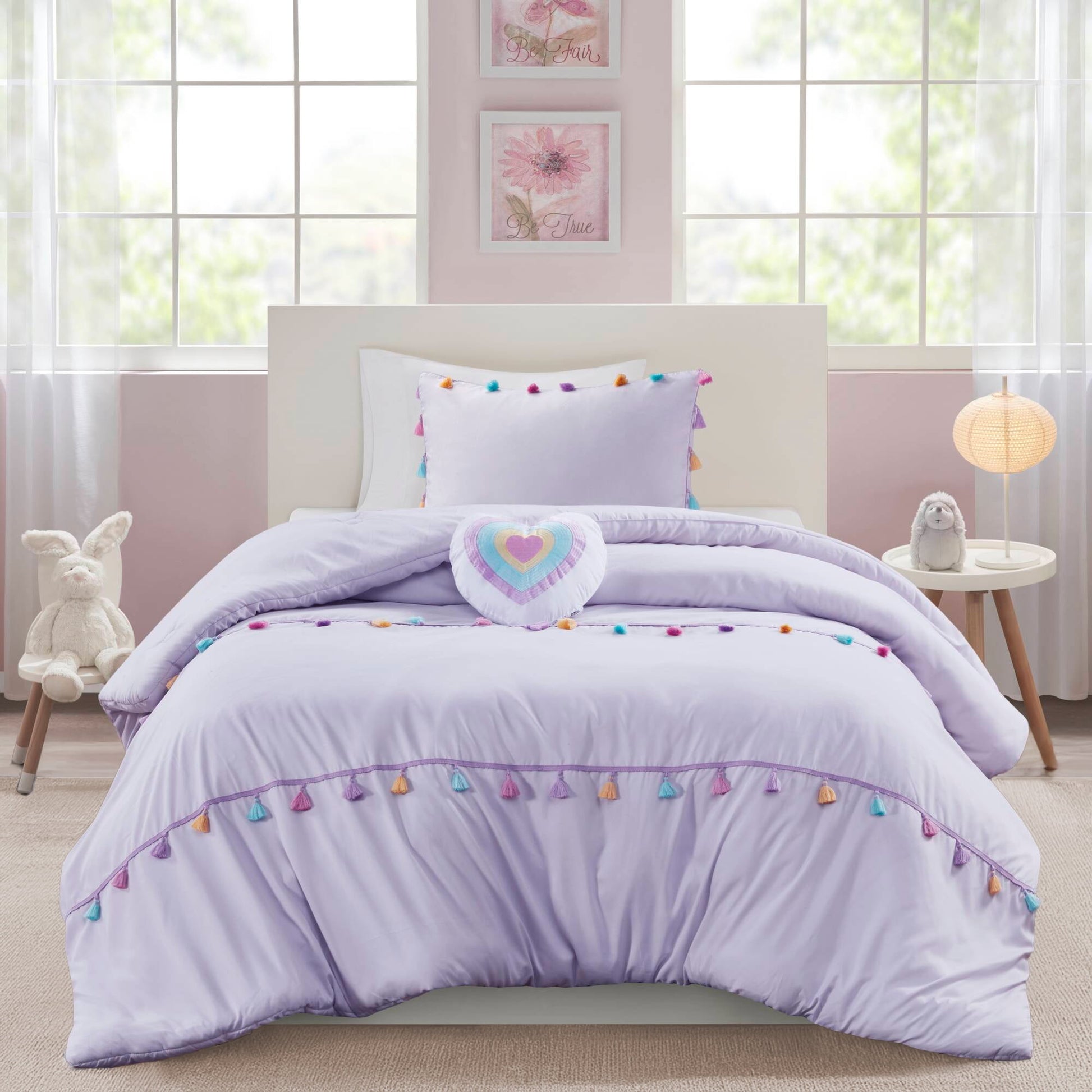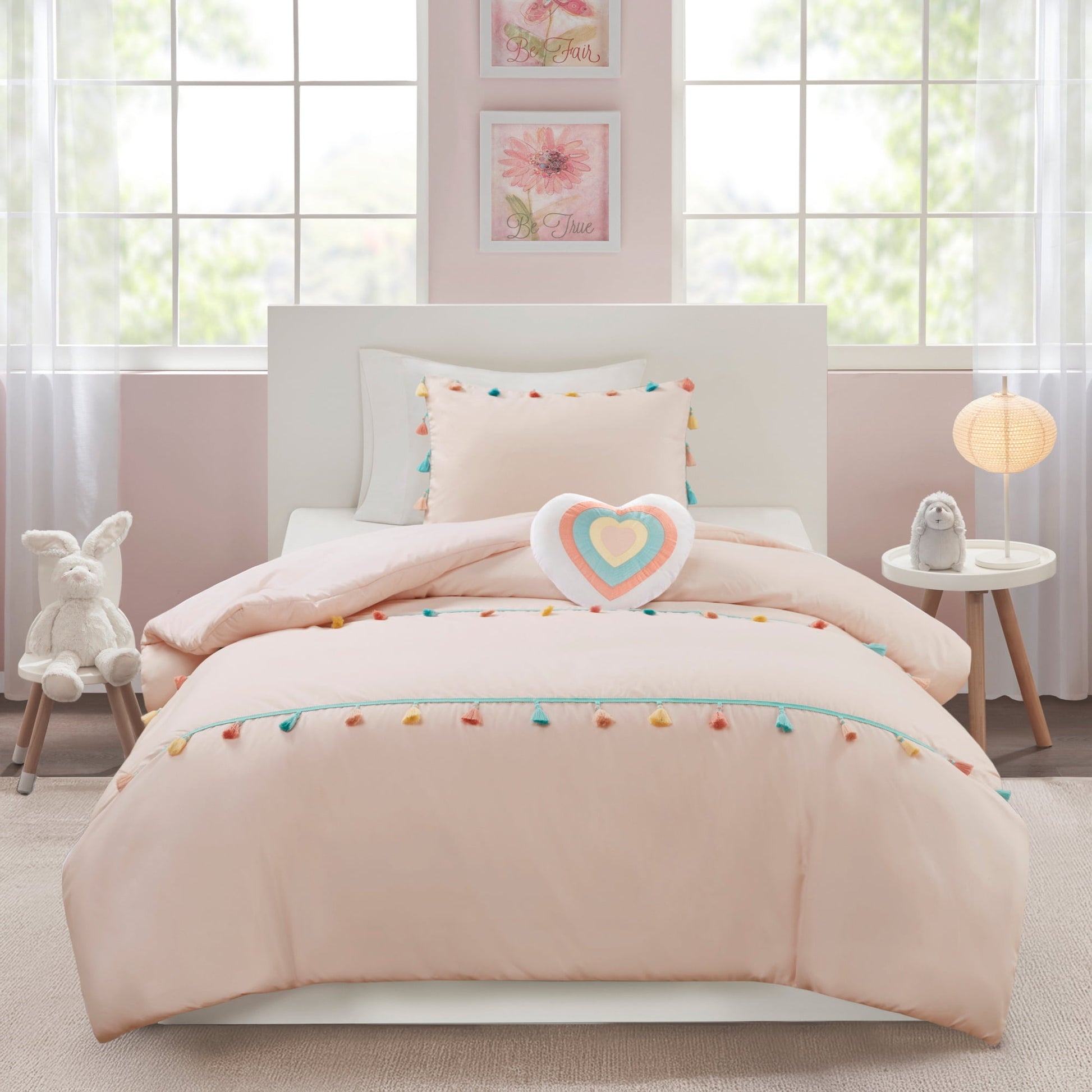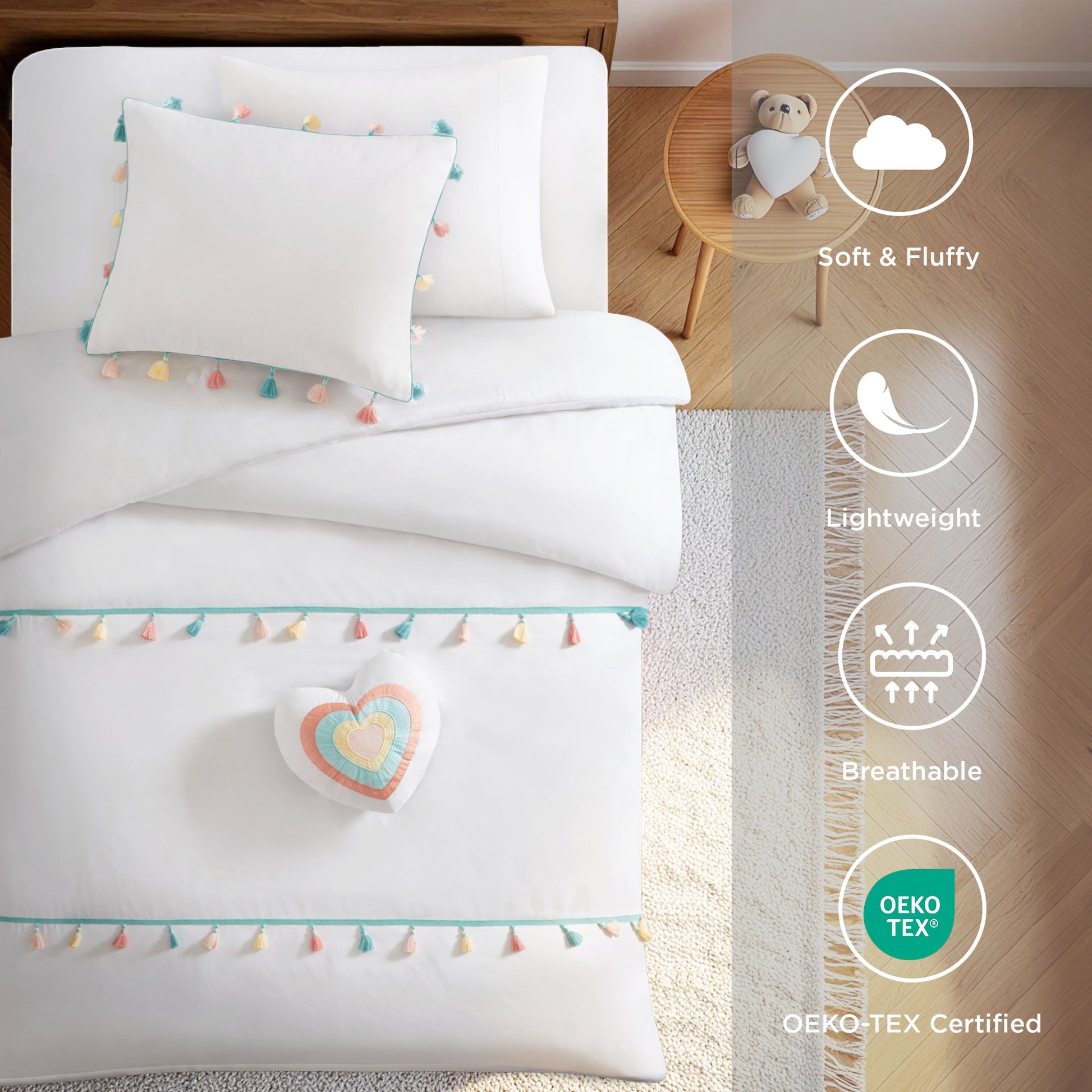 The Kids comforter features multi-colored tassels that add a charming detail to this bedding set. Cute and simple, the comforter offers a fun update to your kid's bedroom, while coordinating shams (1 in Twin) and a heart-shaped decorative pillow with embroidery provide an adorable finishing touch to the bedding set. The high-quality polyester comforter and decorative pillow filling contains no allergens and is treated to be dustproof. Machine washable for easy care, this comforter set is sure to brighten your kid's bedroom decor. This bedding set is also OEKO-TEX certified, featuring an antimicrobial treatment, which keeps the bedding fresher longer.