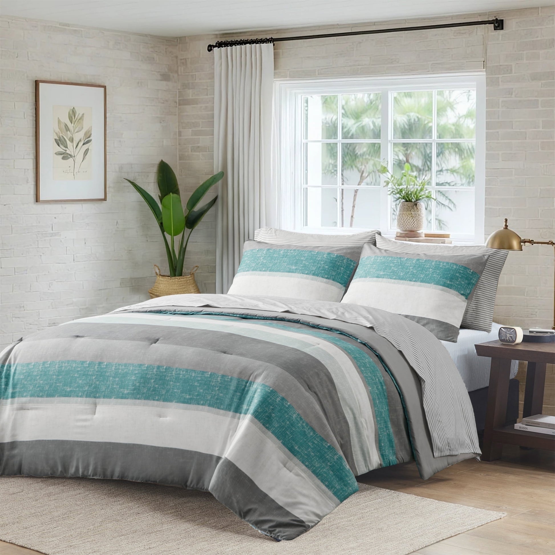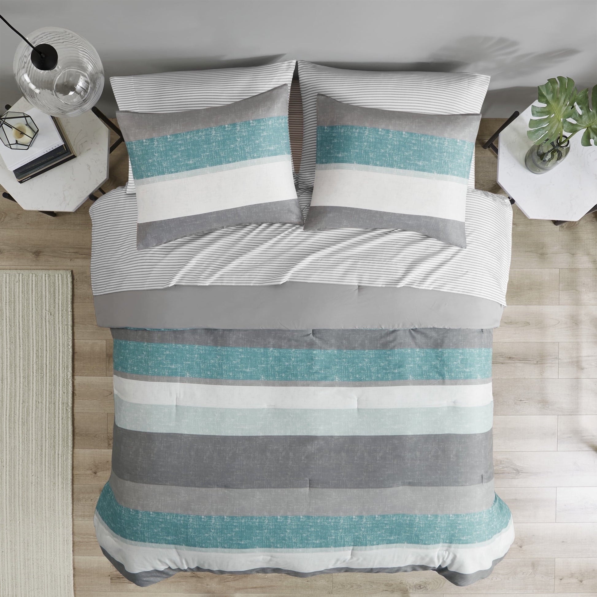 Transform your bedroom with the Regency Heights Essentials Jaxon Bed in a Bag Comforter Set — a complete and affordable bedding solution designed for modern living. This stylish comforter set features a contemporary stripe pattern in shades of grey, white, and aqua, paired with a solid grey reverse for a clean and relaxed look. Perfect for upgrading dorm rooms, guest rooms, or master suites with a modern and fresh aesthetic.