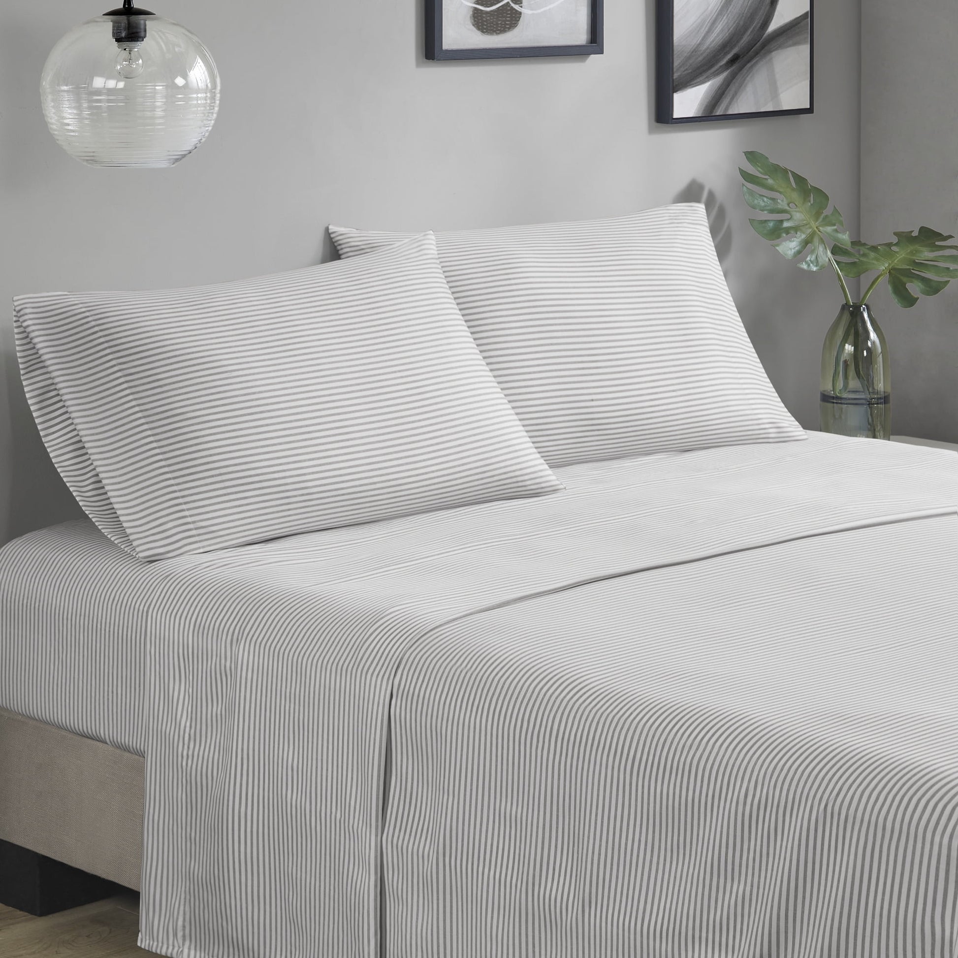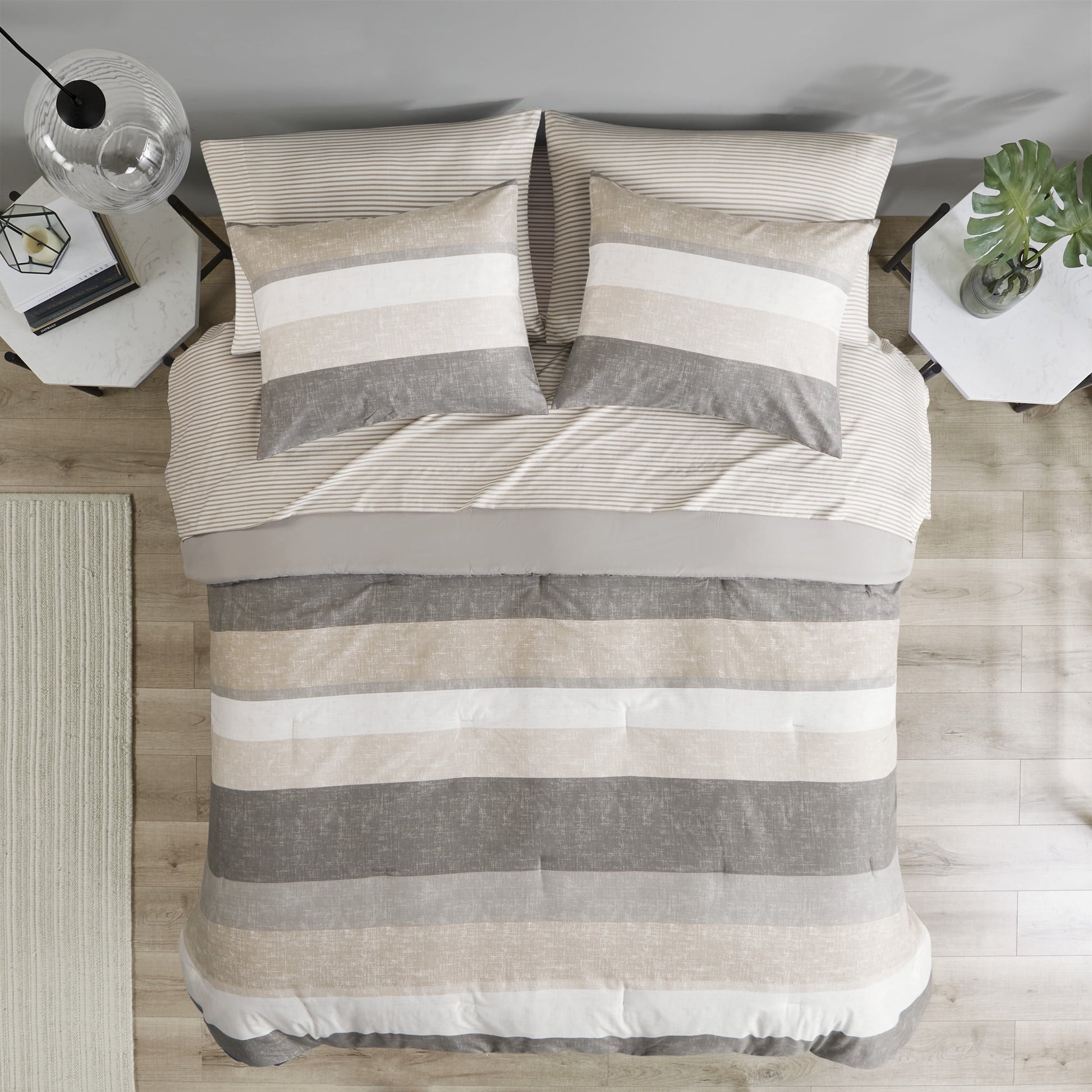 Made from soft and cozy brushed microfiber, the comforter offers all-season comfort and long-lasting durability. The matching sheet set includes a coordinating stripe design that perfectly complements the comforter, creating a cohesive, designer-inspired look.