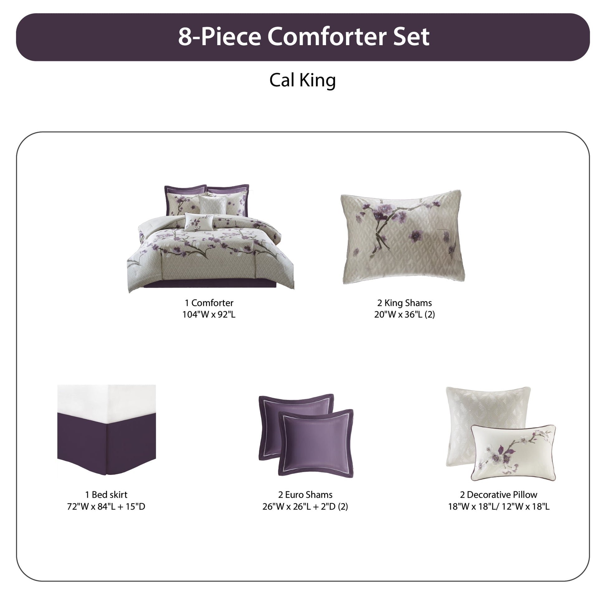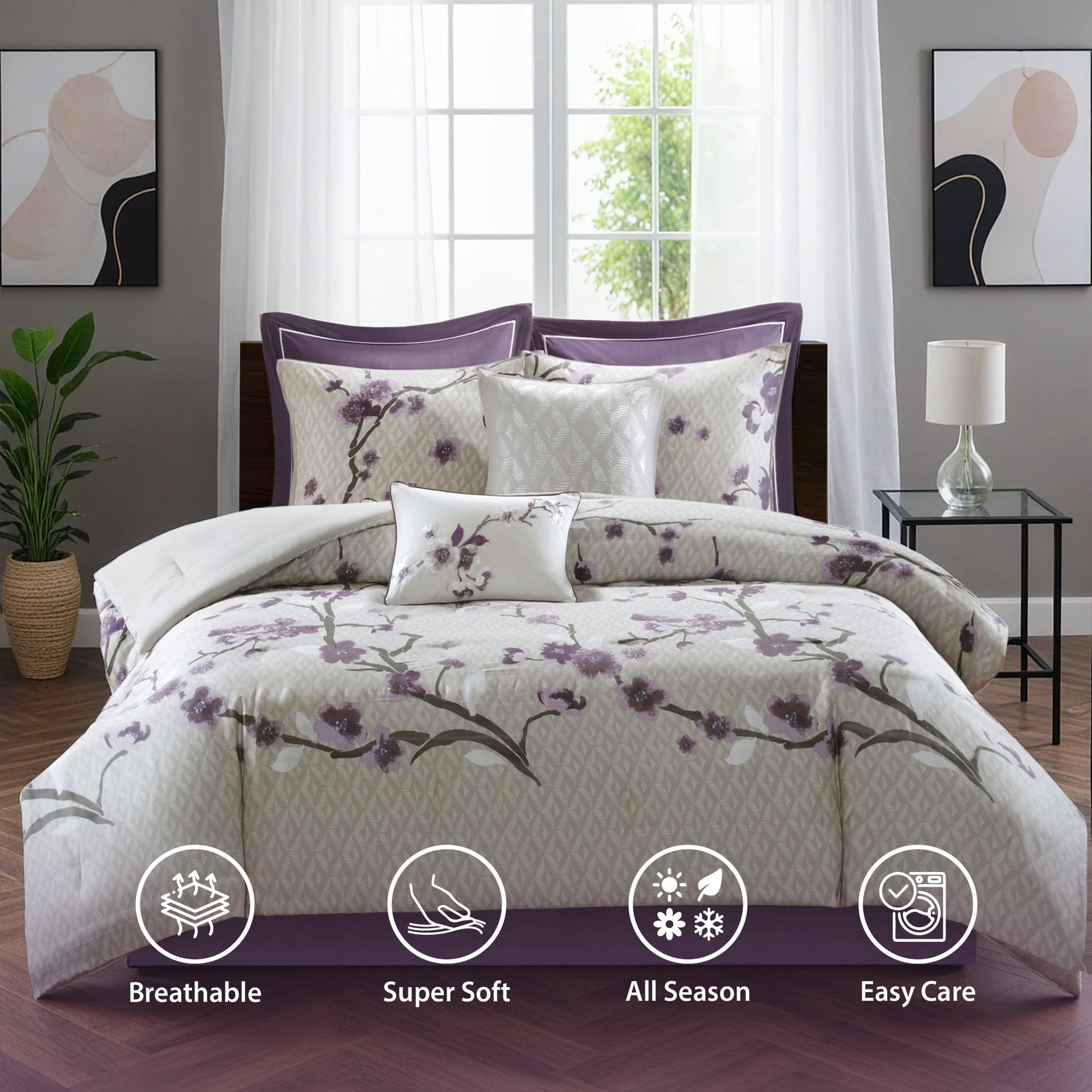8 Piece Floral Comforter Set, Cotton Comforter Bed in A Bag with Bedskirt, Purple/Taupe