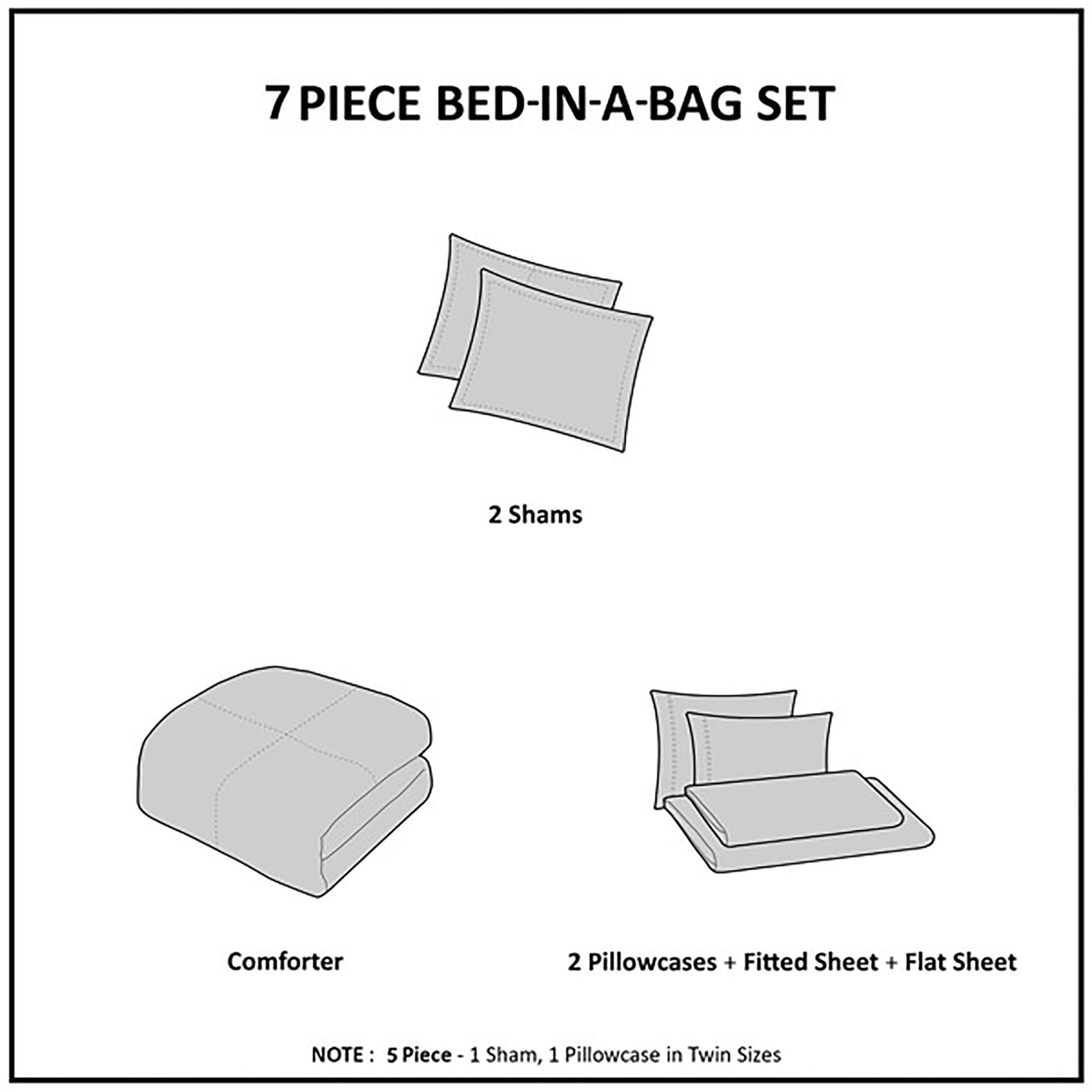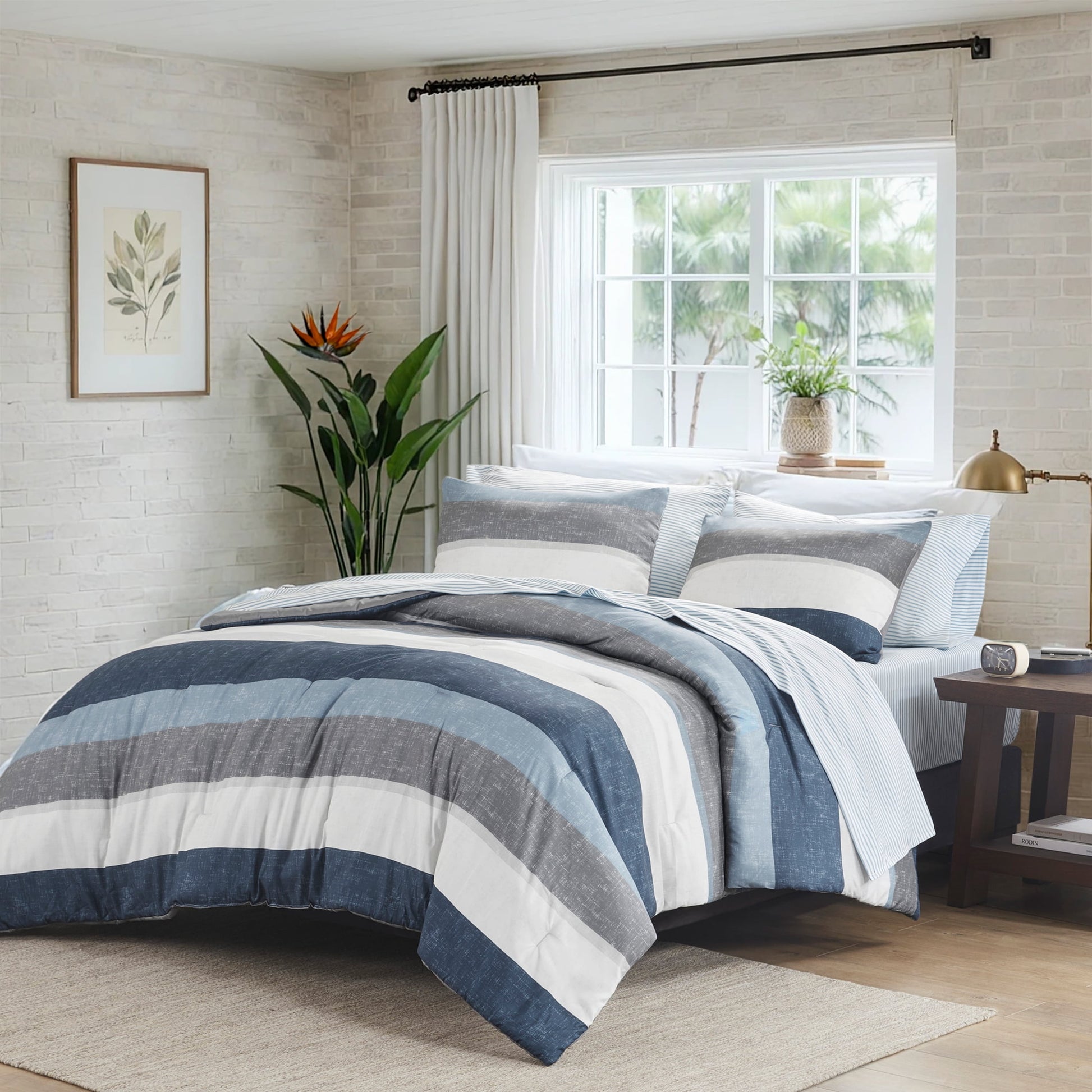 7 Piece Stripe Comforter Set, Bed in a Bag Bedding Set with Flat Sheet and Fitted Sheet, Blue Grey