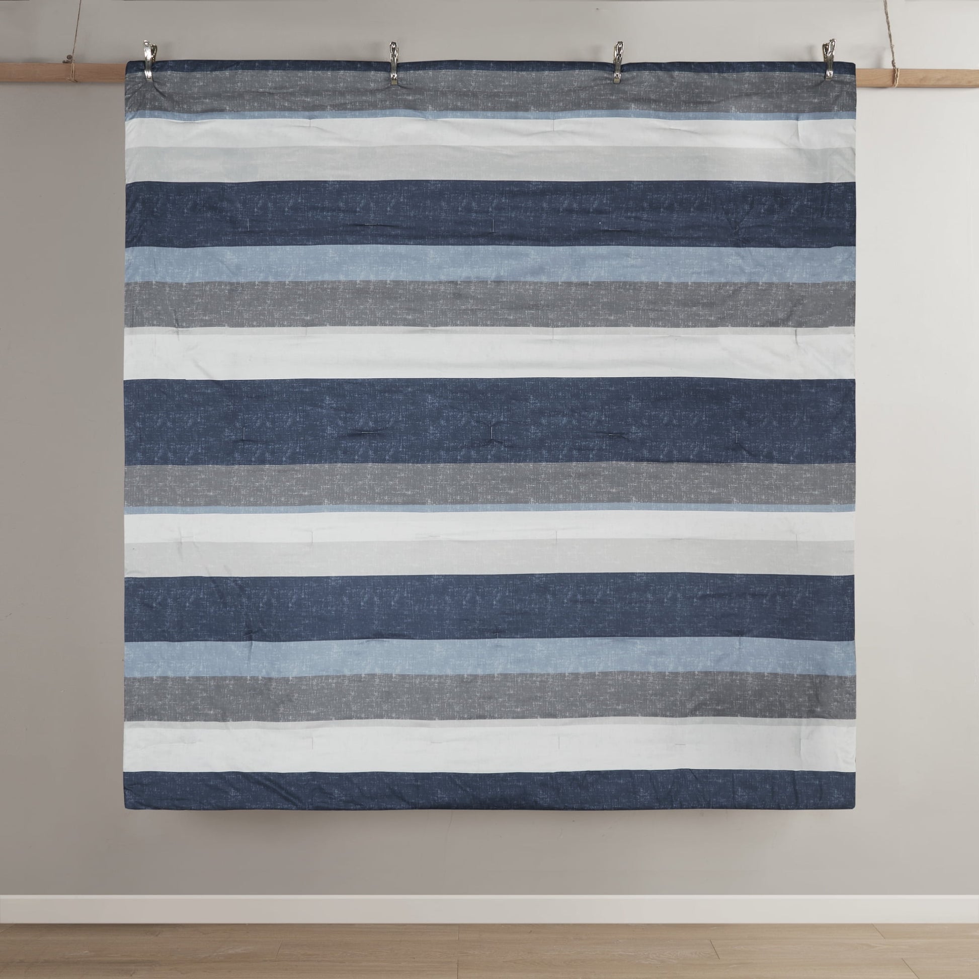 - Stripe comforter look in grey, navy, blue for casual and modern bedroom style with simple coordinating stripe design on sheet set