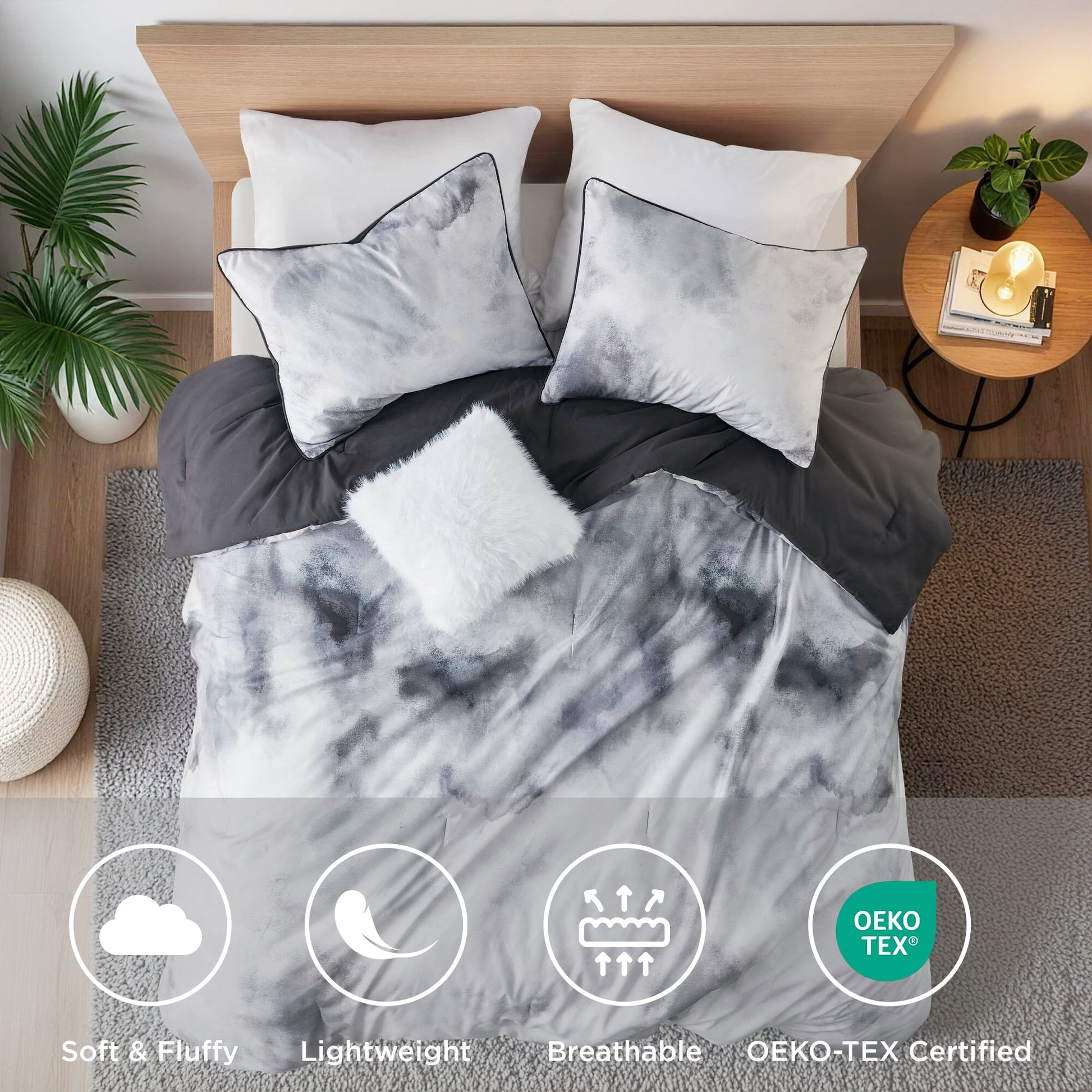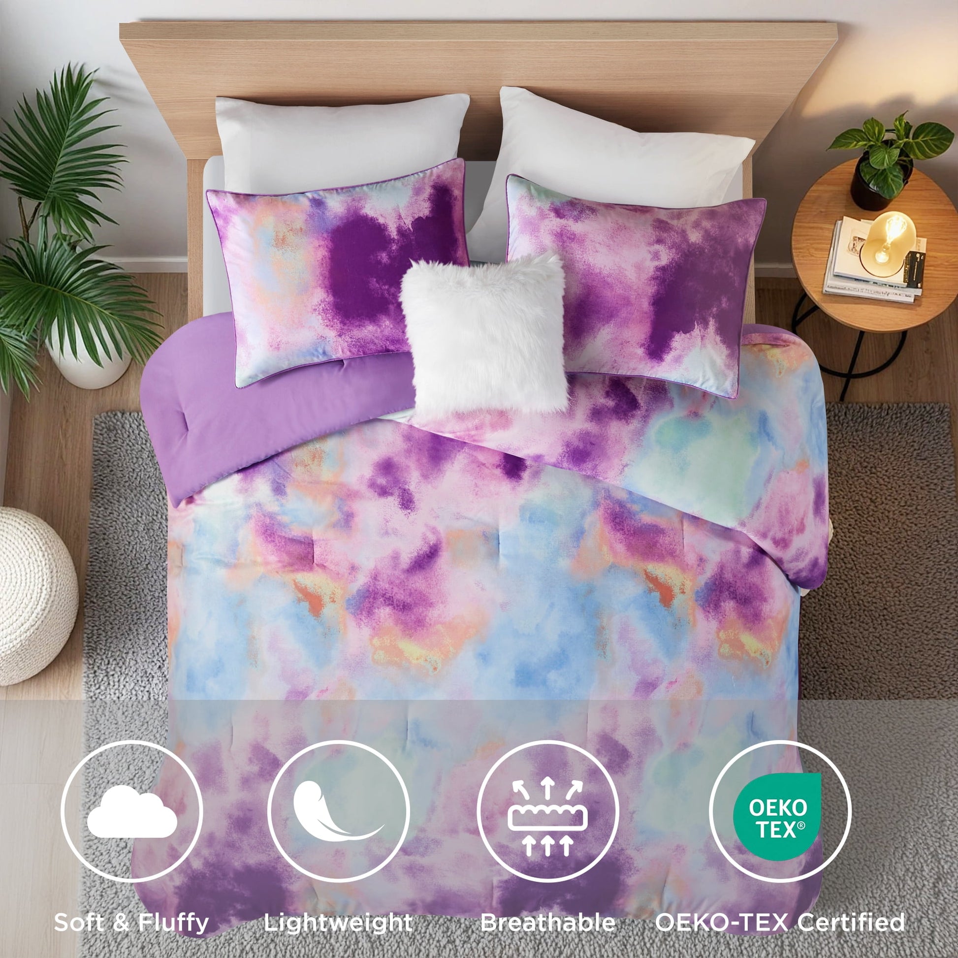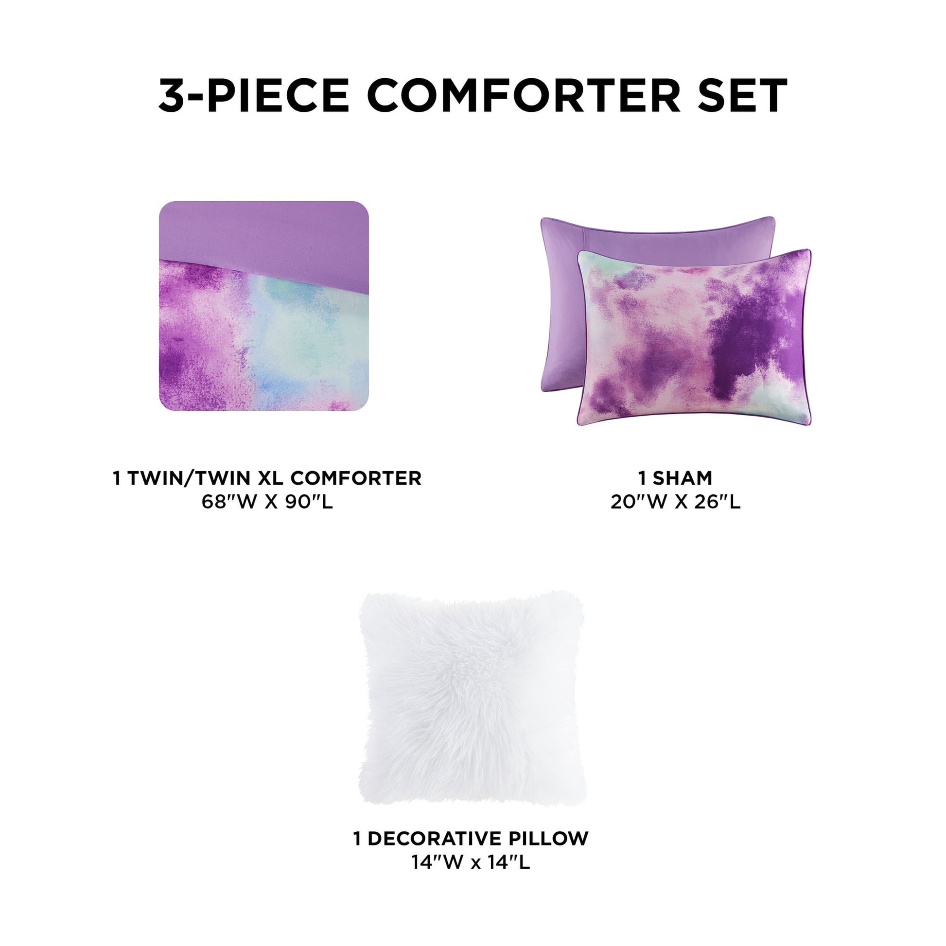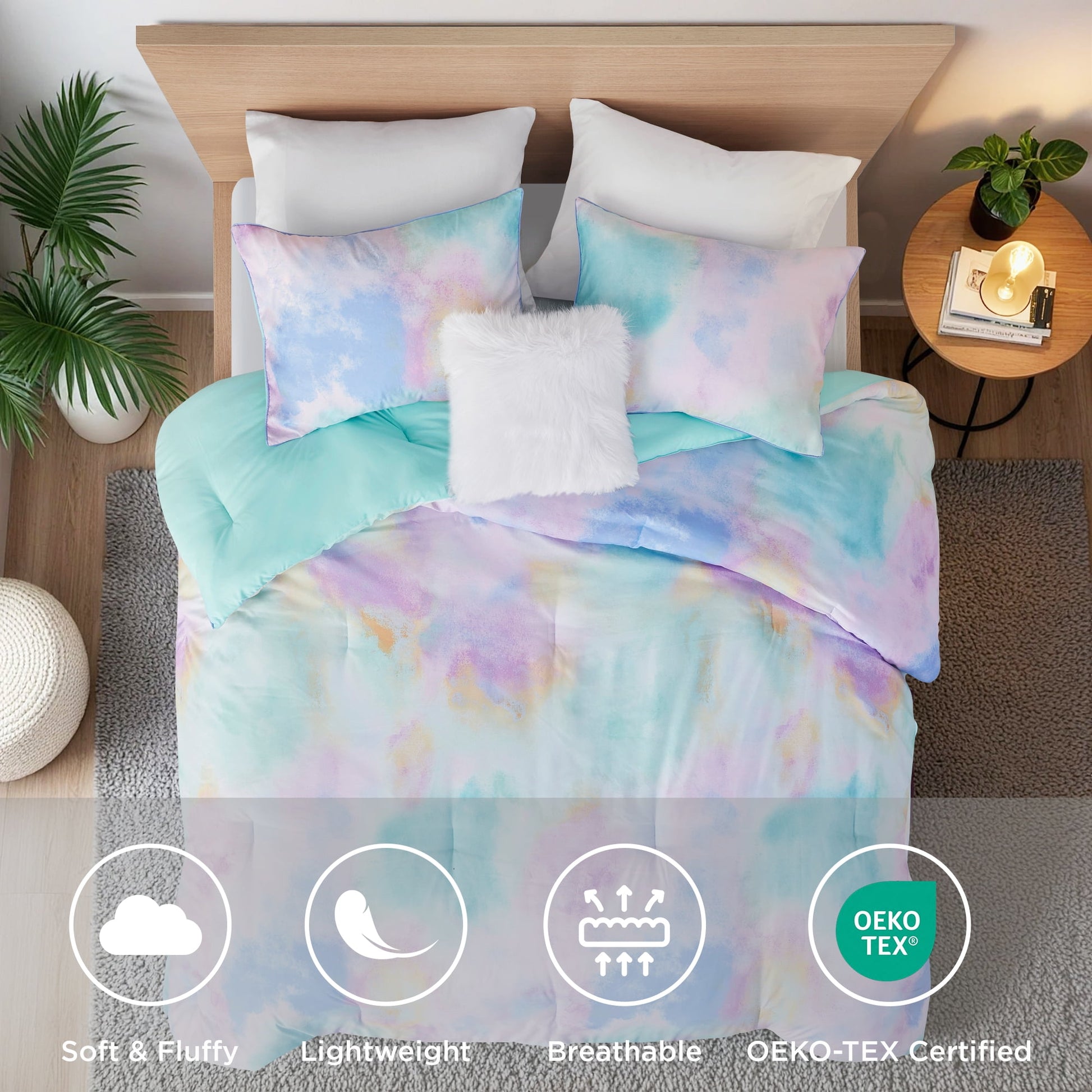 Bring a splash of beautiful colors to your bedroom with the Intelligent Design Cassiopeia Watercolor Tie Dye Printed Comforter Set. This comforter features a watercolor tie dye print with piped edge borders to create a colorful dreamy look. The 2 matching shams (1 in Twin/TwinXL) also have piped edges that pair perfectly with the comforter, and a square fur decorative pillow adds a chic textural touch. The hypoallergenic polyester comforter filling contains no allergens and is treated to be dustproof so you can sleep comfortably. This tie dye comforter set is also OEKO-TEX certified, with added treatment which keeps the fabric fresh and long lasting.