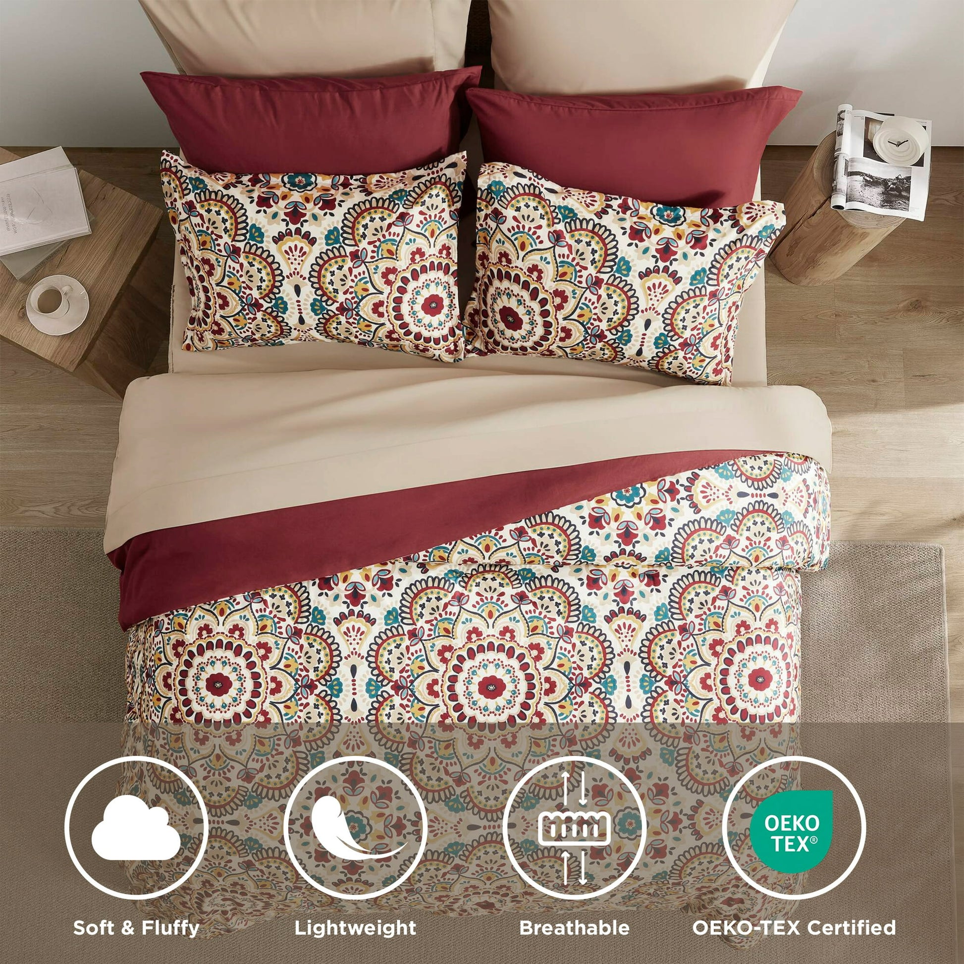Enjoy a soft and cozy night's sleep with this comforter set. The medallion pattern adds a beautiful touch to your bedroom decor, creating a stylish look. Made from ultra-soft microfiber, this red bedding comforter set is lightweight and durable, offering both comfort and breathable. This bed in a bag includes a fitted sheet with convenient side pockets, perfect for storing your essentials close at hand. Machine washable for easy care, our twin xl bedding set is a perfect combination of luxury and practicality.