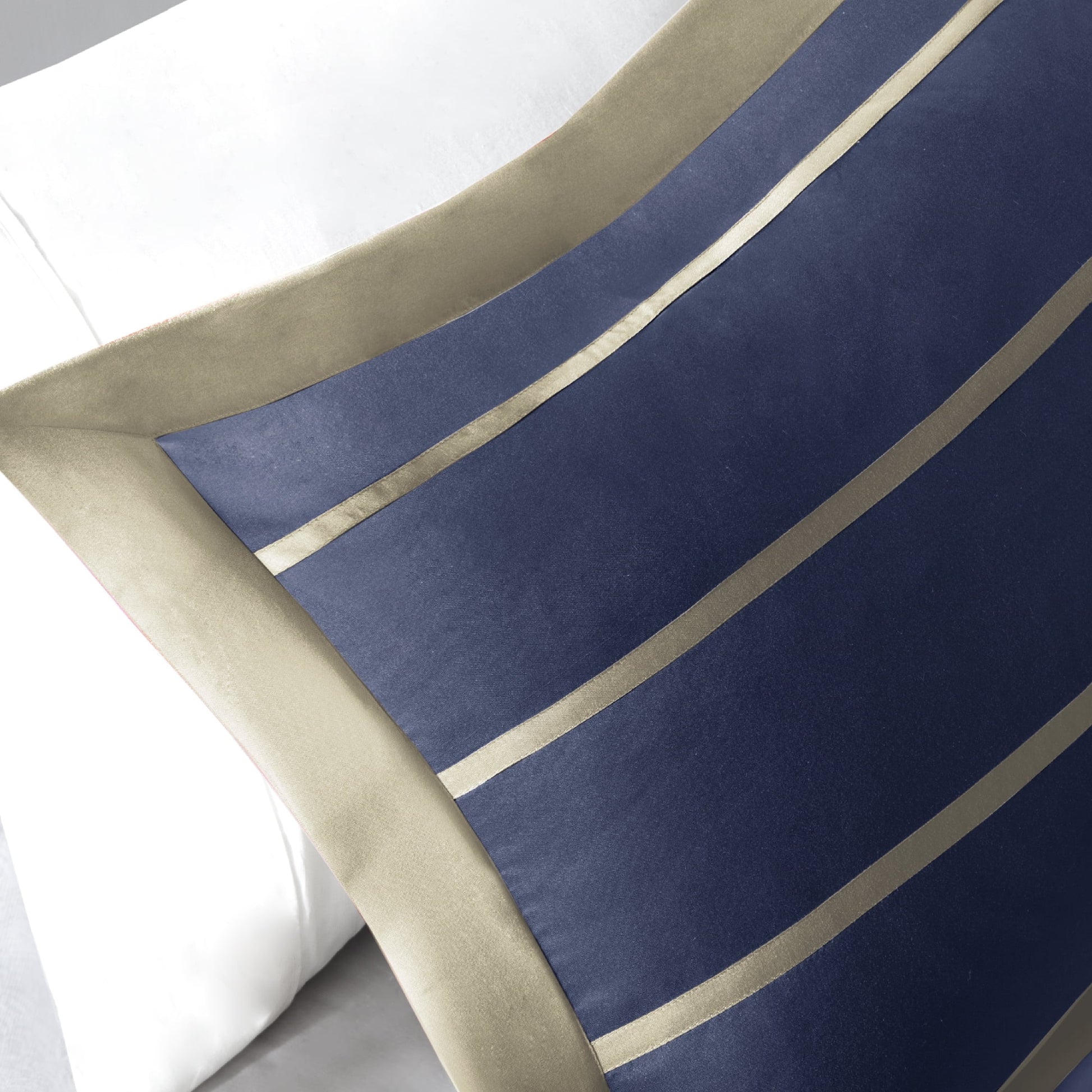 - Matching sham has contrast khaki flange on navy stripes