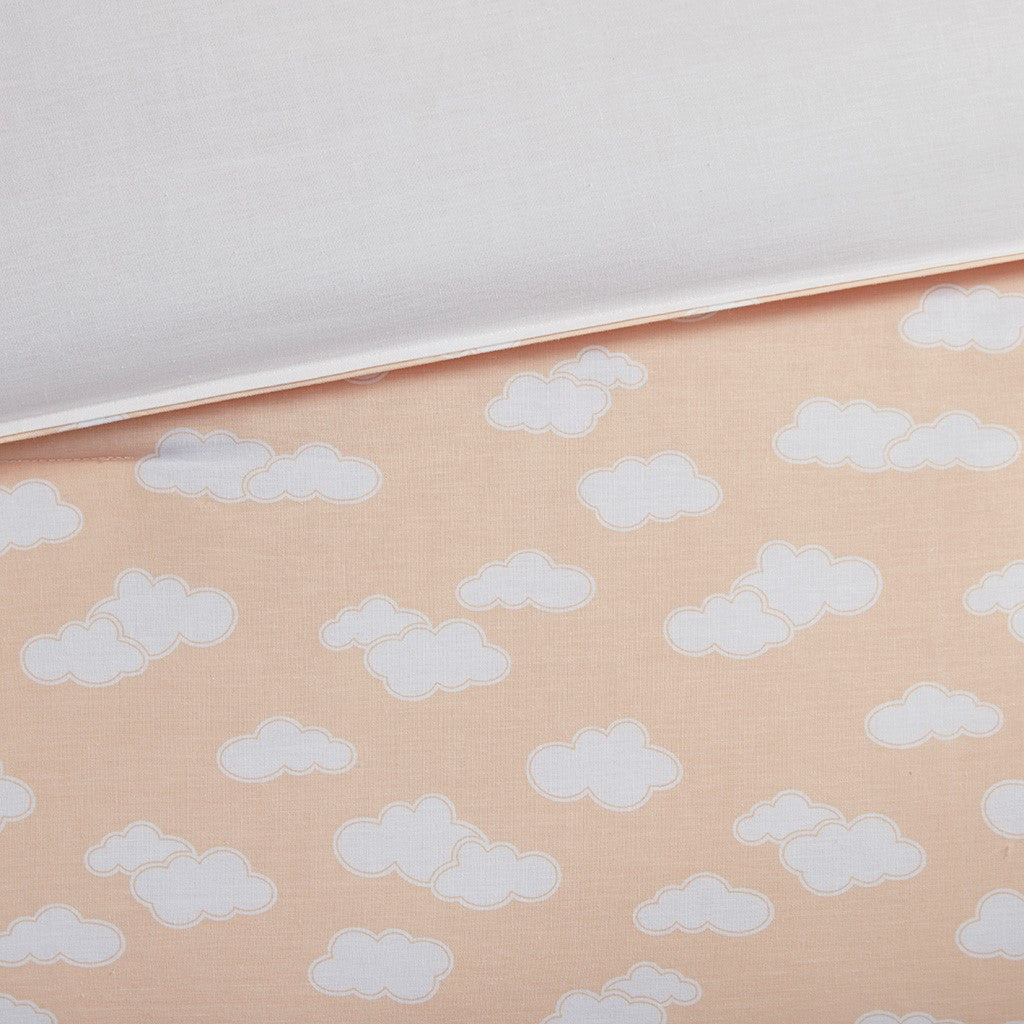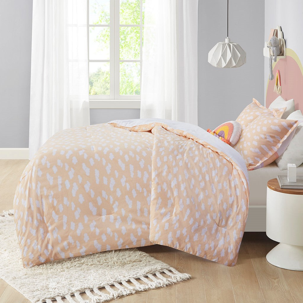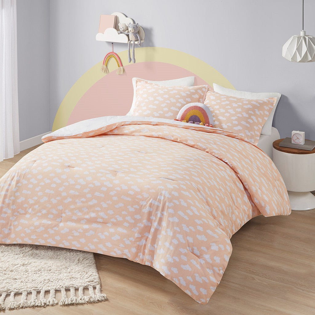 • Add some sunshine to your kid's room with this cotton comforter set • Features a cheerful, smiling sun print that'll brighten up the room • Reverses to a small scale cloud print • Set includes comforter, 2 shams (1 in Twin), and 1 rainbow shaped pillow • OEKO-TEX Certified, includes no harmful substances or chemicals • Antimicrobial treatment helps reduce the growth of odor causing bacteria and keeps fabric lasting longer • Hypoallergenic polyester filling in the comforter and pillow • Machine washable and steam iron for wrinkle removal • Items in this set may come in rolled or compressed packaging and will need to be fluffed up