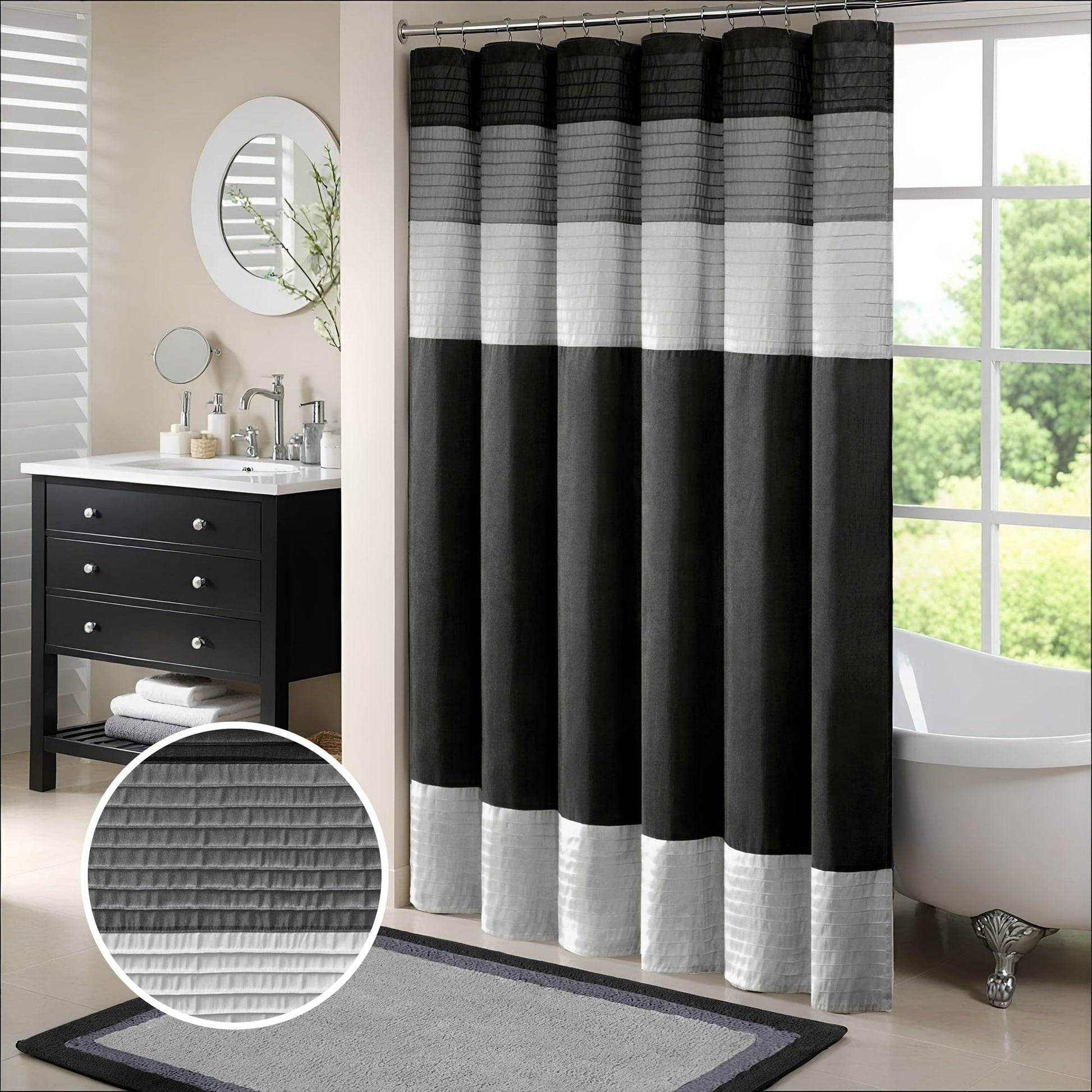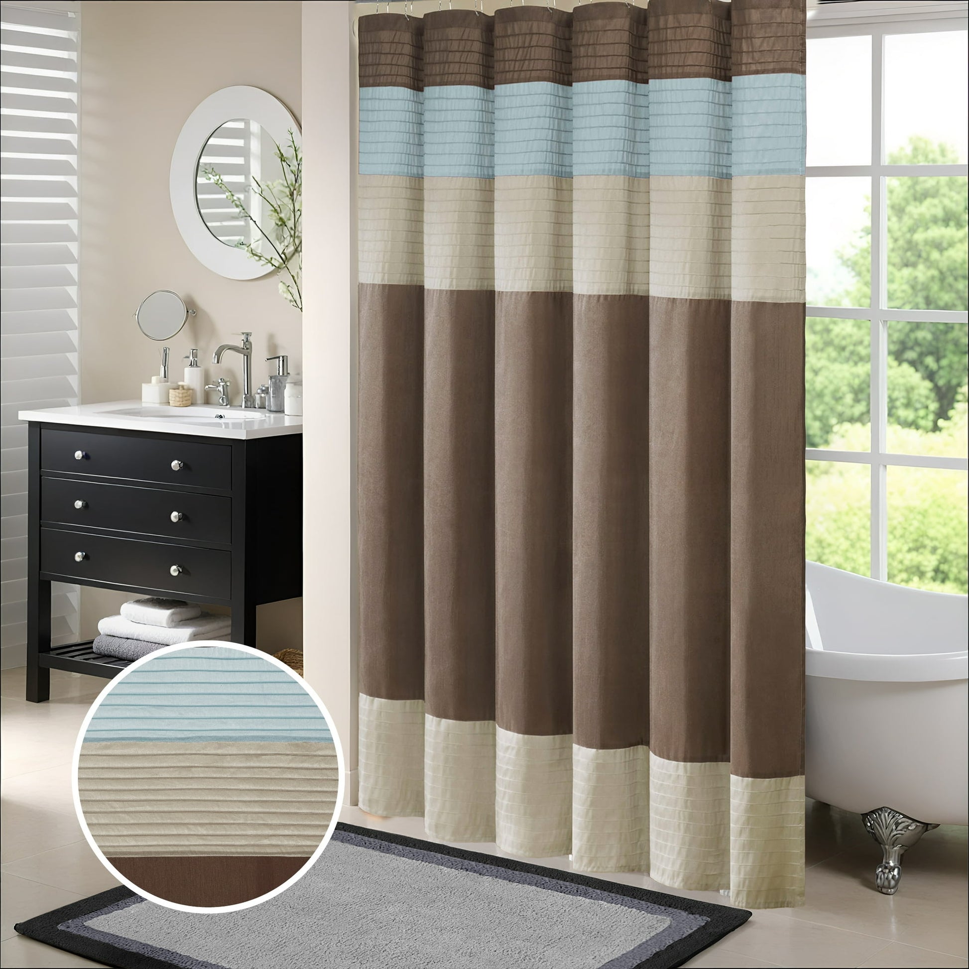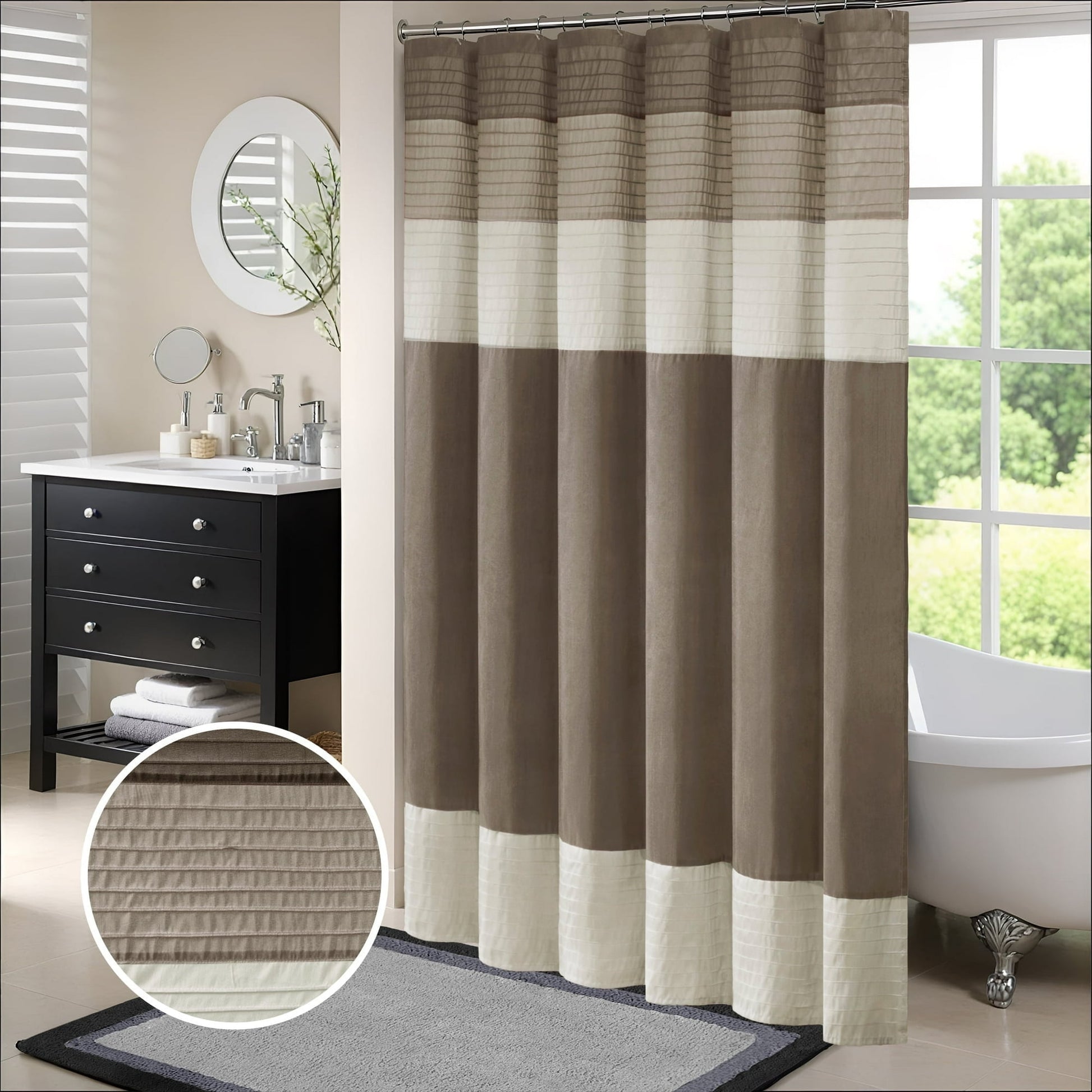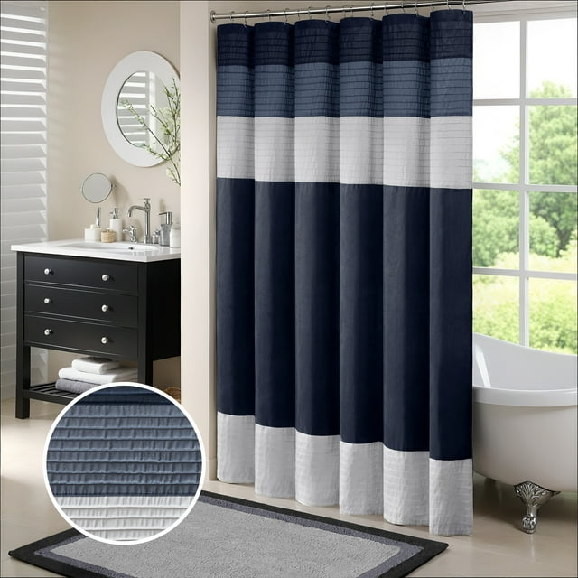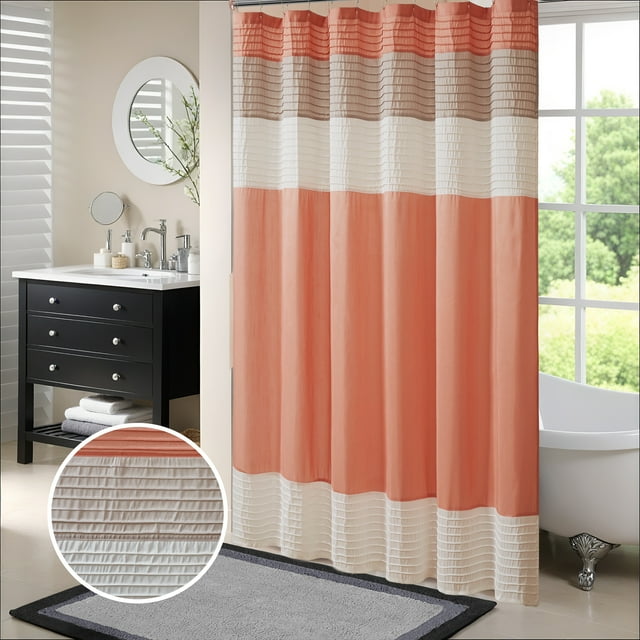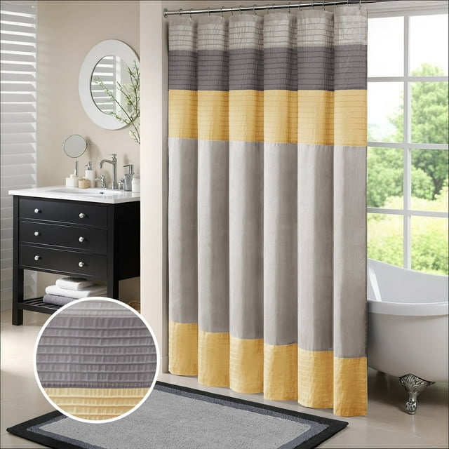 Easily transition your bathroom with this simple, yet beautifully classic shower curtain. The faux silk dupioni fabric has a natural light sheen and drapes beautifully, while also machine washable for easy care. This lightweight shower curtain features pieced and pintucking details creating a rich texture and a unique color block design, sure to freshen up any space. Pattern layout may vary due to variation of sizes. A water repellant liner is not included, and highly recommended. Complete the collection and look with coordinate bath decor, bedding, and window decor - available and sold separately.