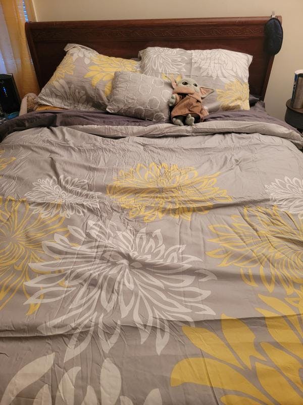 Needed a replacement set and also a pop of color ( without going overboard). This set is subtle yet gives a warming effect with the beautiful hue of yellow that contrasts the grey and white. The comforter is comfy and provides great coverage . The set is a welcoming addition my bedroom!