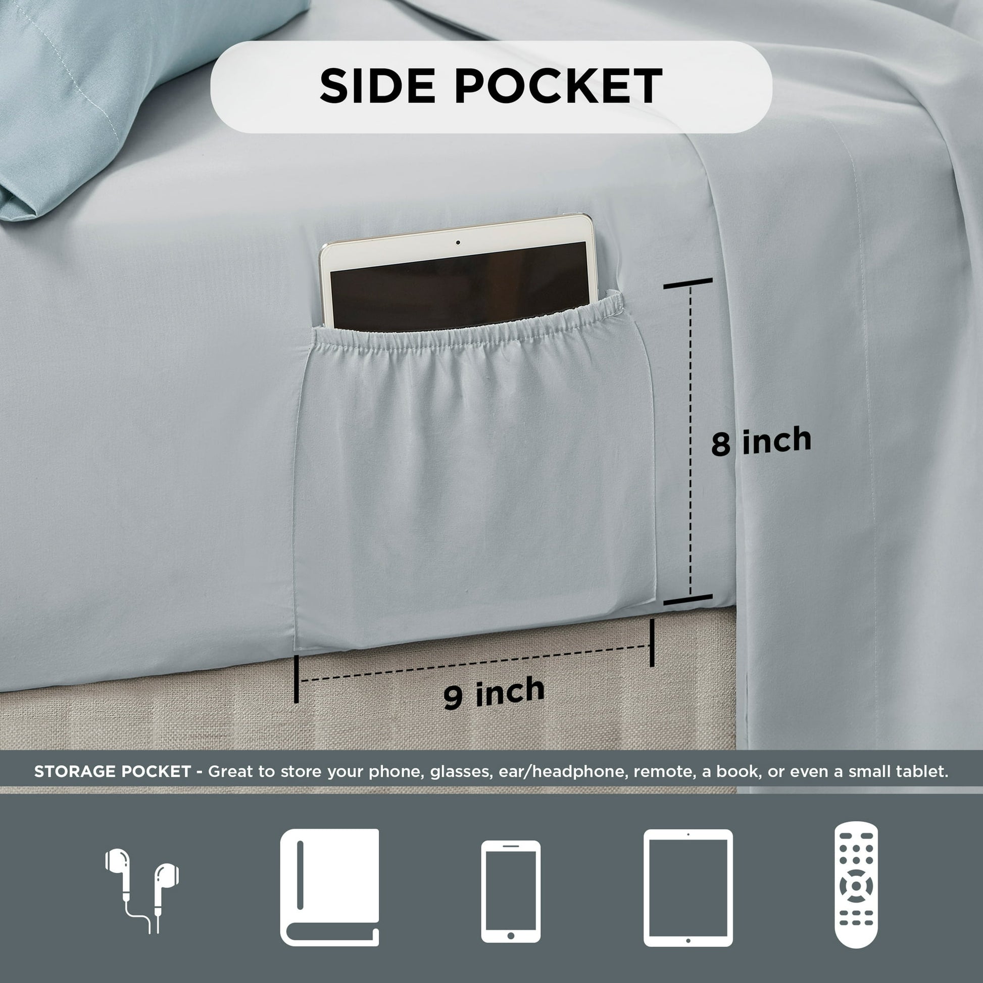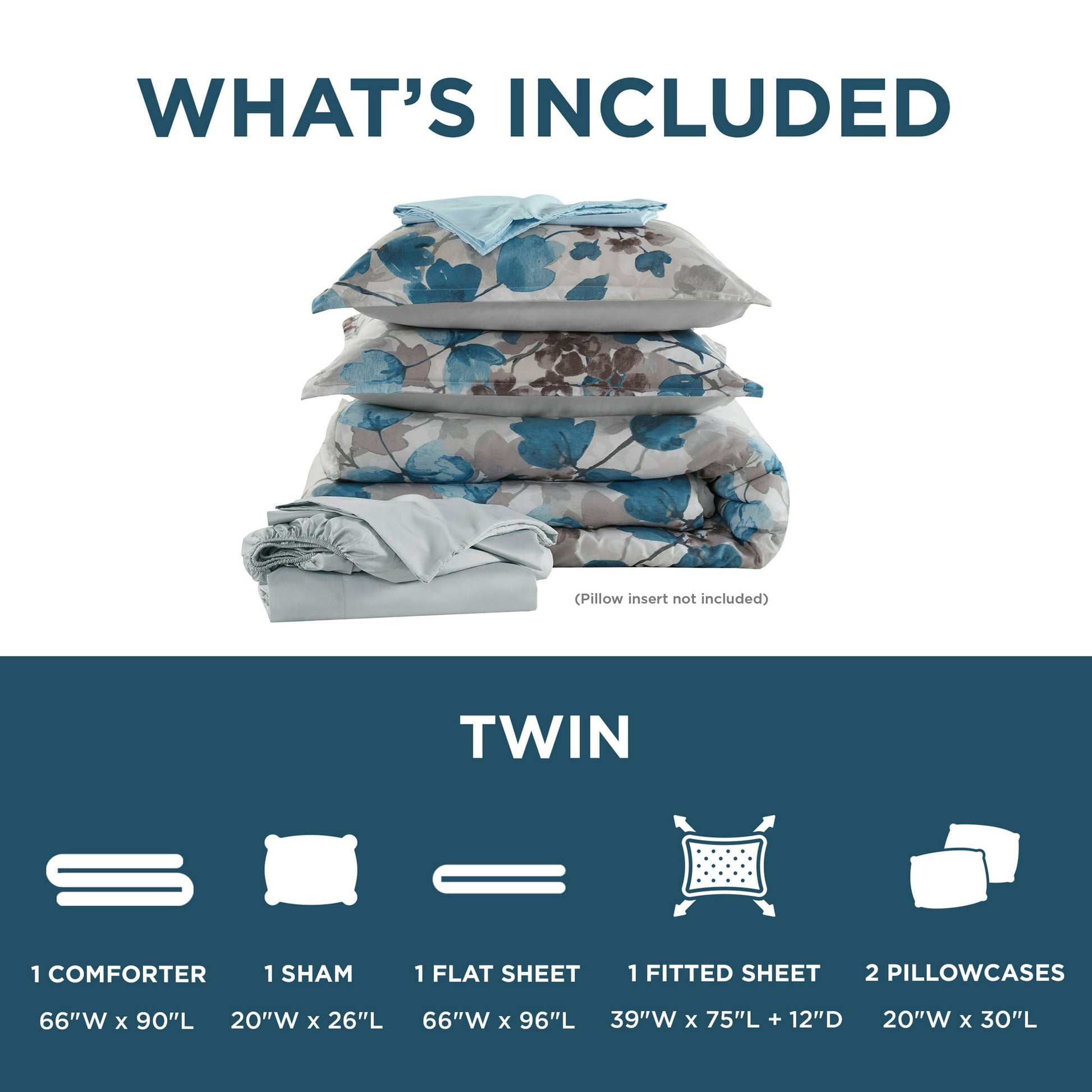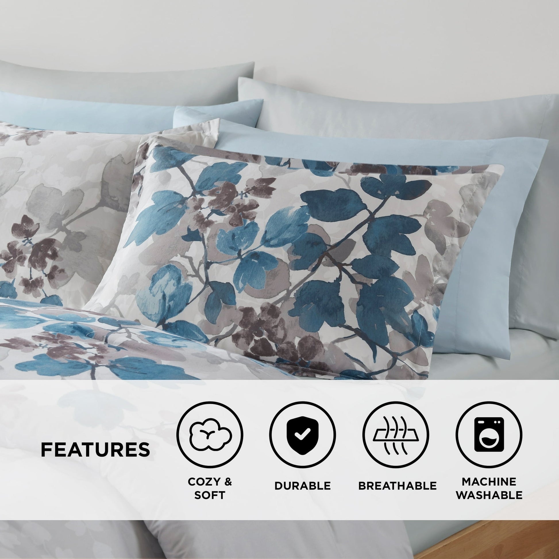 Breathe new life into your bedroom with this beautifully modern floral comforter set and bed sheets. A stunning blue, white, and gray leafy floral print on ultra-soft microfiber to create a cozy and stylish botanical look with a contemporary flair. A complete sheet set in a coordinating grey color is also included, along with bonus pillowcases in blue. The fitted sheet is specially designed with 2 side pockets on each side as convenient storage for your cell phone or small electronic devices. Transform your bed and add a touch of elegance and charm with this bed in a bag.