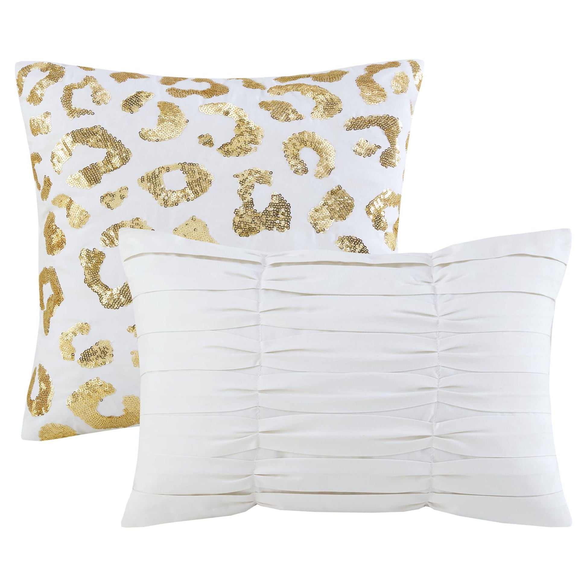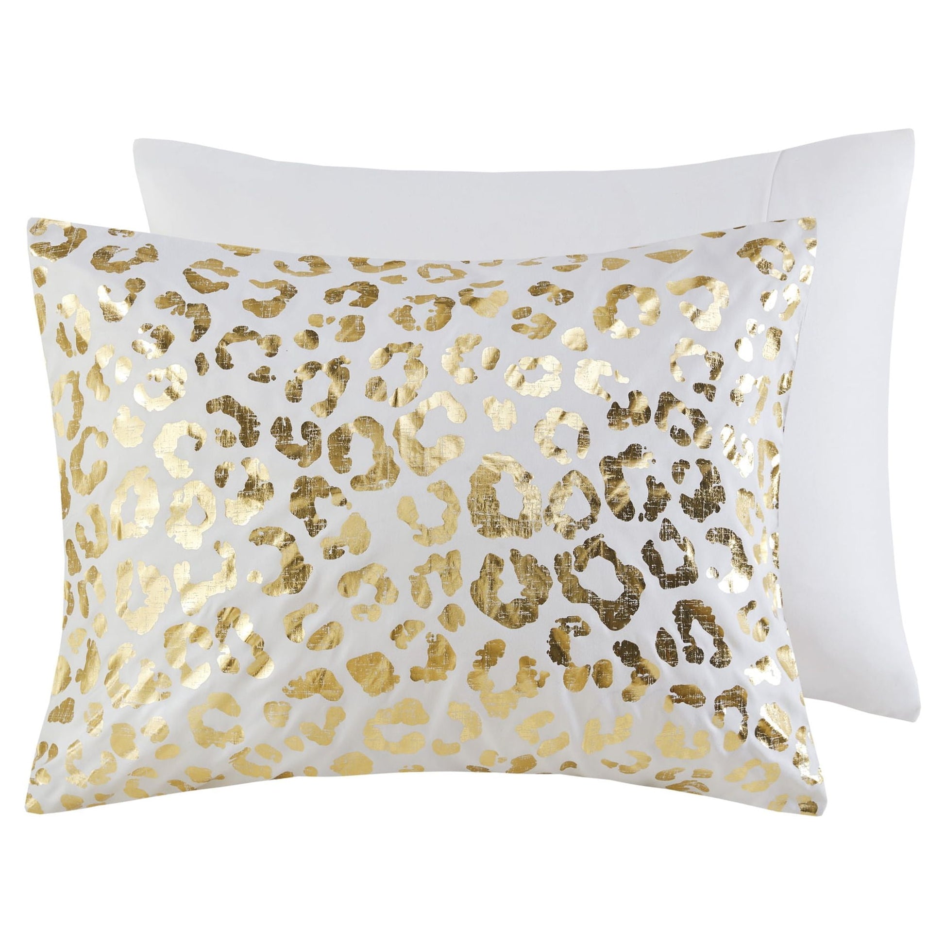 Add a fierce and flashy look to your bedroom with the Home Essence Apartment Kendra Metallic Animal Printed Duvet Cover Set. The ultra-soft microfiber duvet cover flaunts a stunning gold metallic animal leopard print on a light base, for a modern glam look. Matching shams (1 for Twin/TwinXL) pair perfectly with the duvet cover, while two decorative pillows add the finishing touches to the duvet cover set. This bedding set is OEKO-TEX certified, meaning it does not contain any harmful substances or chemicals, and uses an antimicrobial treatment that provides built-in freshness protection, reducing the growth of odor causing bacteria to keep fabric lasting longer. Button closures allow you to place a comforter insert within the duvet cover and internal corner ties help prevent it from shifting (Insert is NOT included).