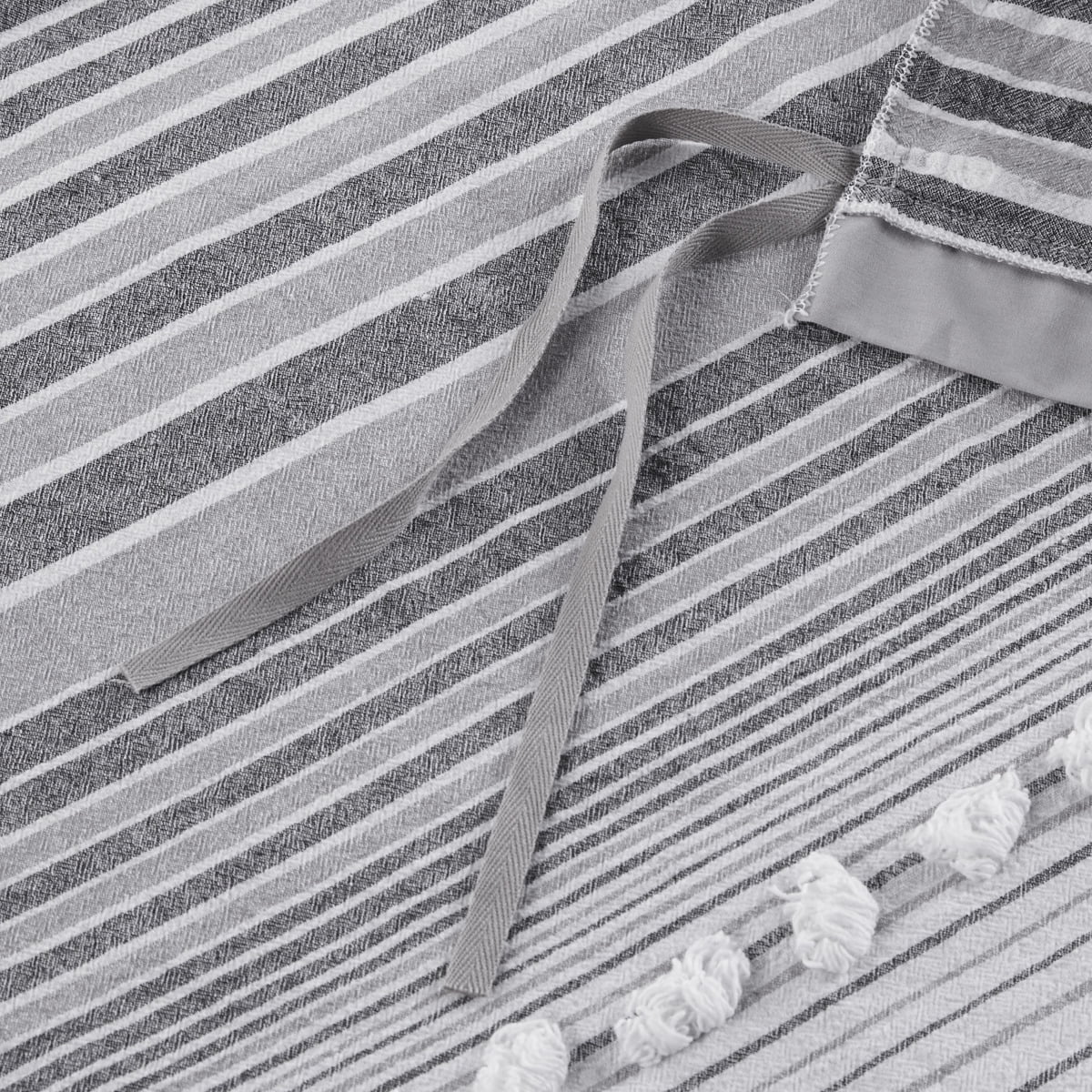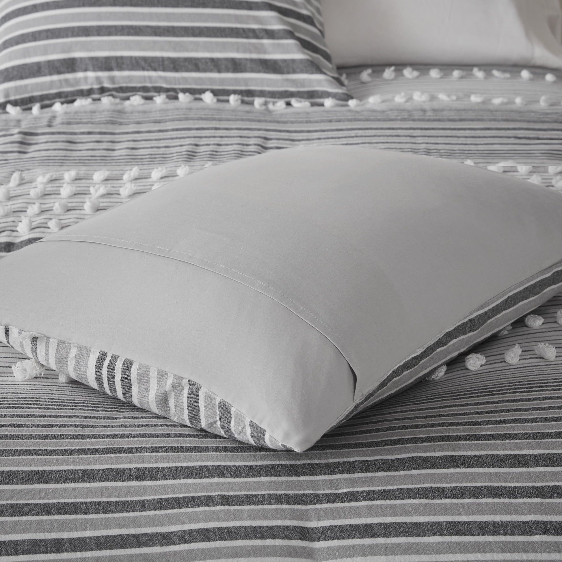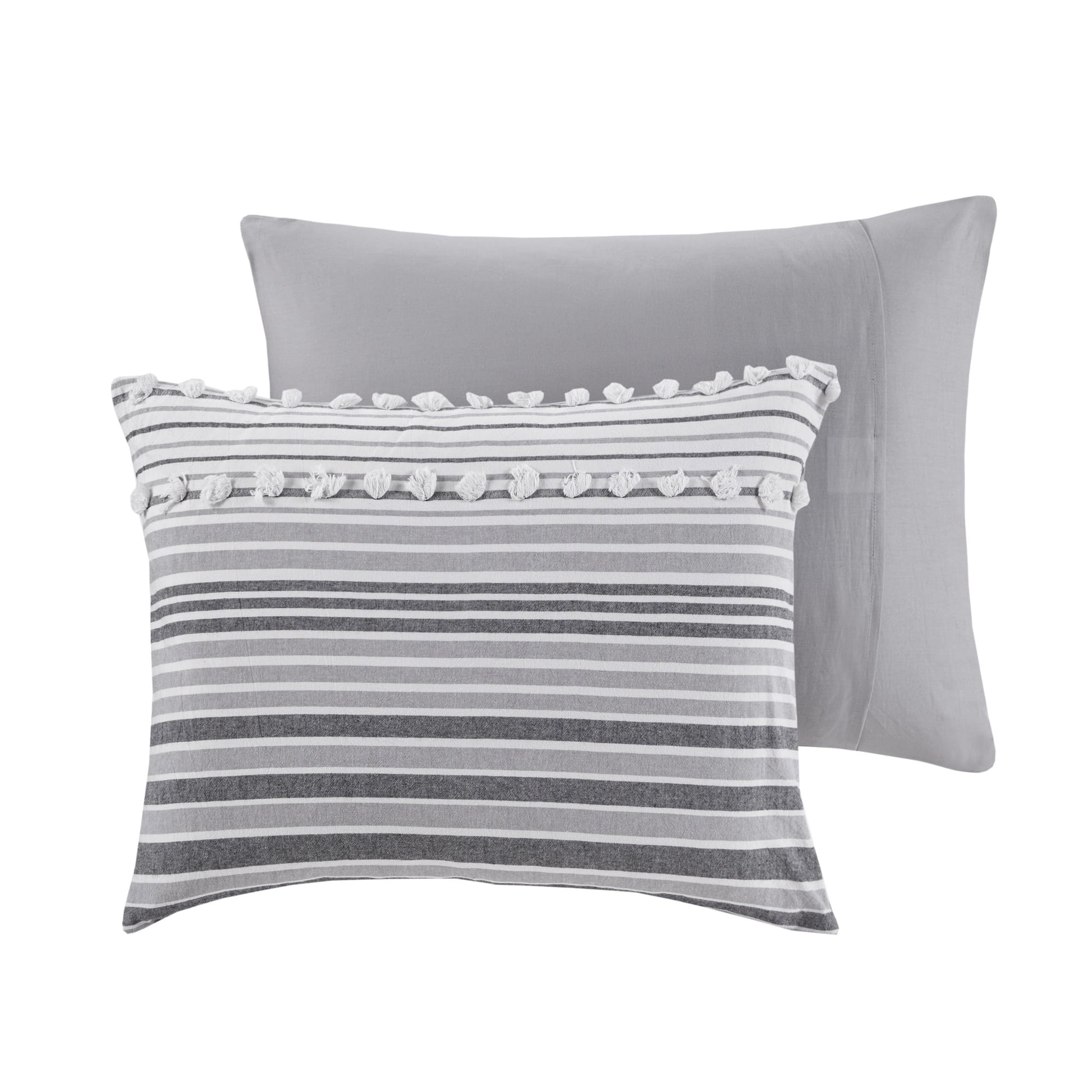 Give your bedroom a soft casual update with the Jacquard Yarn-Dyed Stripes Cotton Duvet Cover Set. The cotton clipped jacquard duvet cover features yarn-dyed stripes, for a soft and alluring look. Matching shams (1 for Twin/TwinXL) mirror the design seen on top of the bed, while two decorative pillows with hypoallergenic polyester filling add the finishing touches. This bedding set is also OEKO-TEX certified, meaning it does not contain any harmful substances or chemicals to ensure quality comfort and wellness. Button closures on the duvet cover secure a padded insert (NOT included) within the duvet cover and internal corner ties prevent it from shifting.
