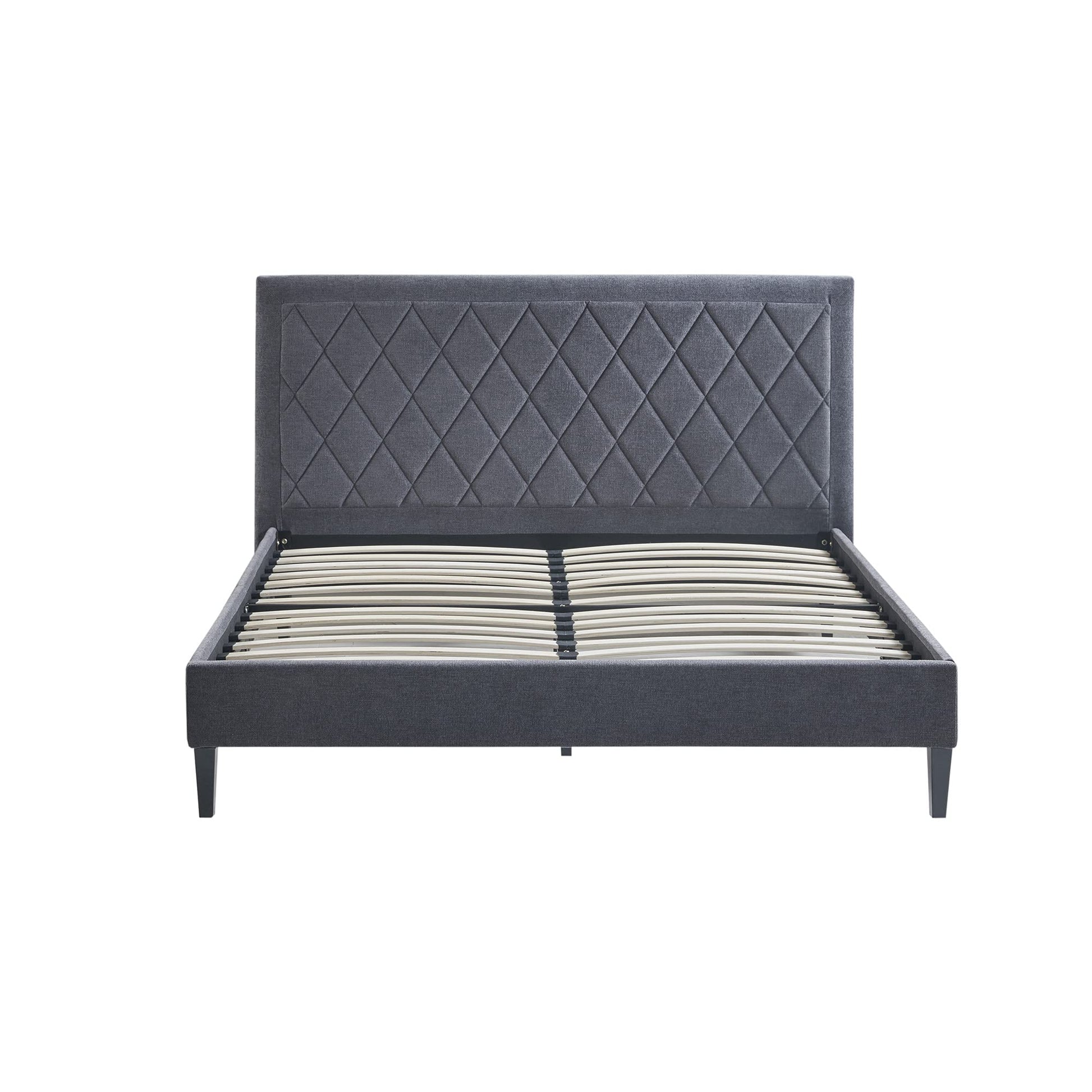 Enhance your bedroom with this Queen Size Bed Frame, showcasing a fully upholstered frame and an elegant diamond tufted headboard that brings a modern and transitional flair to any decor. The slat support system eliminates the need for a box spring or foundation, improving airflow and extending mattress life. Built with a durable solid wood frame and sturdy middle support, it can accommodate up to 600 lbs. This low-profile bed frame is compatible with all mattress types and is suitable for all age groups. Easy to assemble and stylishly designed, it’s a versatile and practical addition to your home.