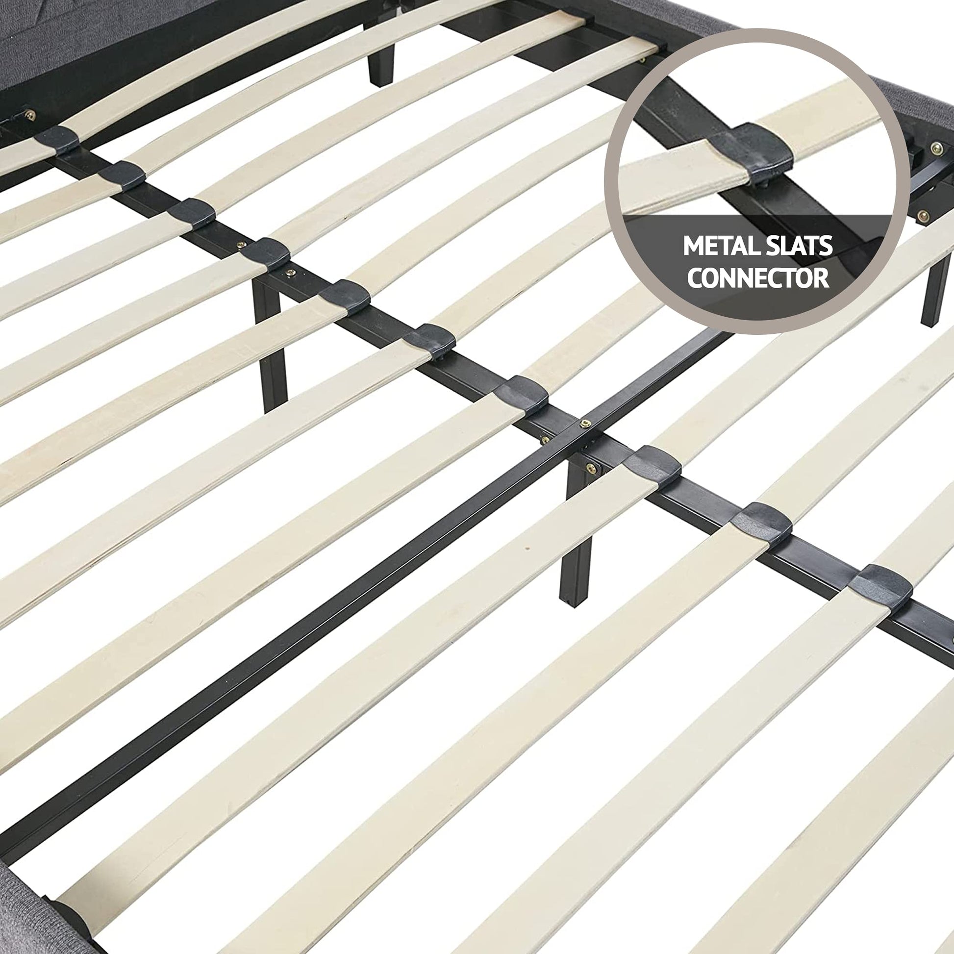 Modern contemporary look upholstered bedSolid wood construction with middle support legsSolid hue charcoal gray premium fabric upholstered frameChannel tufted headboard and low-profile footboard6-inch underbed clearance provides storage solutionCompatible with all mattresses, no box spring neededDurable wood frame supports up to 600 lbs.Easy to Assemble - All parts and tools attached to the back of the headboardCare Instruction(s): Vacuum or Spot Clean