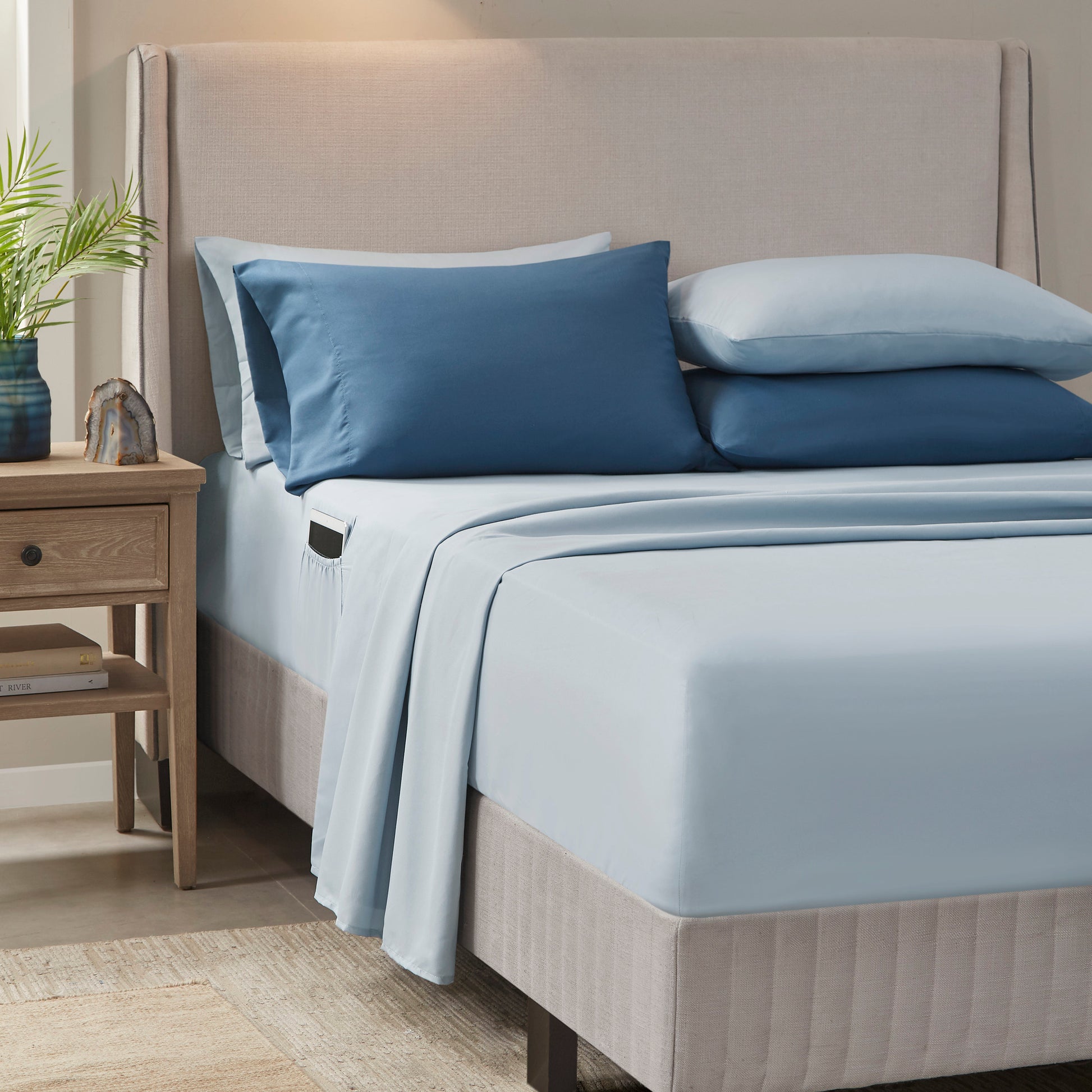 - Features: Also included is a complete sheet set in solid aqua blue that features a fitted sheet with a side pocket on each side for extra bedside storage, perfect for your small electronic devices.