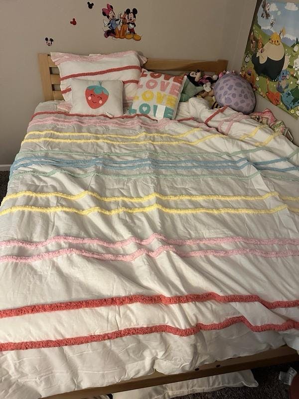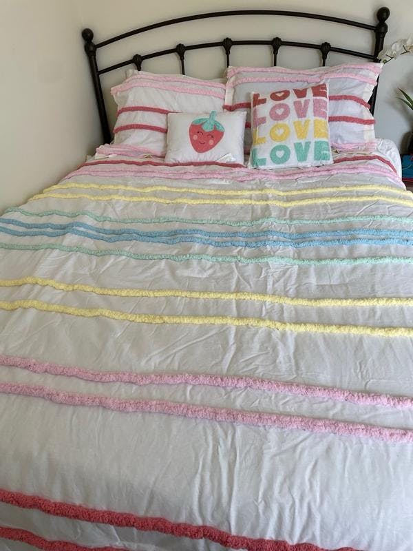 This Haisley Cotton Comforter Set with Chenille Trim came with a comforter, 1 pillowcase, and 2 throw pillows The comforter is white with colorful stripes of chenille going across it It is very bright and cheerful The throw pillows are super cute too One has a strawberry while the other has love written on it in chenille material I got this set for my little granddaughter who just transitioned out of a crib and into a regular bed I wanted her to have a bright and fun comforter set to liven up her room To make it a happy space for her to sit and sleep She absolutely loves it The strawberry pillow is her favorite and she loves the softness of the chenille The comforter keeps her nice and warm while she sleeps It is perfect for the cooler nights as we transition into winter This set makes her room feel happy and bright It's a wonderful set for a little girl I'm very happy with the quality and the design of this comforter set It is easy to care for and clean It really does makes a cheerful atmosphere in her room