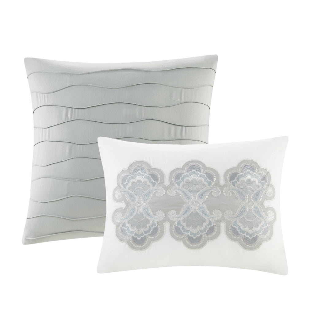 Add an elegant touch to your bedroom with the Comforter Set. The beautiful comforter features a large paisley print in a soft teal hue with a solid grey reverse, for an exquisite look. Matching shams mirror the pattern of the comforter, while the solid Euro shams coordinate with the bedding set to pull the entire ensemble together. Two decorative pillows, one with embroidery and another with fabric manipulation, add dimension and charm to the top of the bed. Completing the comforter set is a solid grey bed skirt with a 15-inch drop to give your bed a clean finish. Machine washable for easy care, this ultra-soft microfiber comforter set brings style and grace to your space. The comforter is vacuum sealed. Upon opening of the package, please place it in a dryer in low heat to fluff it back to its original shape.