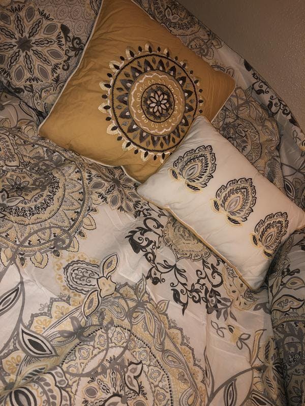 This Isla 8 piece Cotton Floral printed reversible comforter set is GORGEOUS! The patterns are wonderful and so intricate. It's very stylish and beautiful made for sure! I love how this comforter feels too. It's not too heavy and it's not too thin, I feel like it's perfect for me. The decorative pillows add such a nice touch too. The pillows are very soft and at first I was worried about the designs on the pillows being rough or scratchy but they honestly feel great! All in all this is a great comforter! Would definitely recommend!