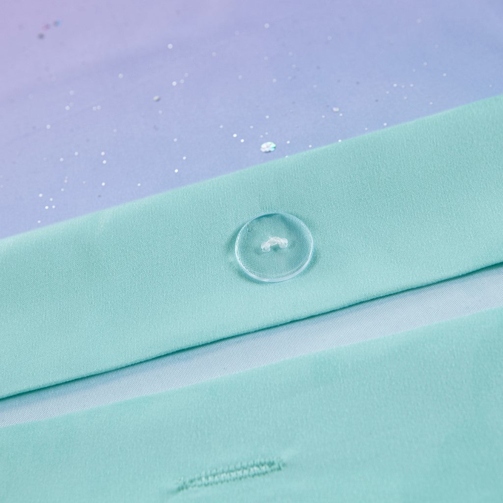 The Metallic Glitter Printed Reversible Duvet Cover Set brings a lively and colorful update to your bedroom. This ultra-soft reversible duvet cover features an ombre pattern of aqua, blush, and pastel purple that flips to a solid aqua on the reverse. Matching shams (1 for Twin Sizes) come in a variety of colors that coordinate with the duvet cover, while brilliant sparkles and glitter adorn the contemporary duvet cover set allover, creating fun and magical look. An oblong pillow provides the perfect finishing touch to complete the duvet cover set. Hypoallergenic filling in the pillow also provides exceptional warmth and comfort. Machine washable for easy care, this printed reversible ombre duvet cover set is sure to brighten your bedroom with a whimsical flair. Sham varieties include aqua, blush, and pastel purple colors; only 1 color variety in each bedding set. This bedding set also uses an antimicrobial treatment that provides built-in freshness protection, reducing the growth of odor causing bacteria to keep fabric lasting longer. Items in the set may come in a rolled or compressed packaging, which will need to be fluffed up or steam ironed before use to remove wrinkles.