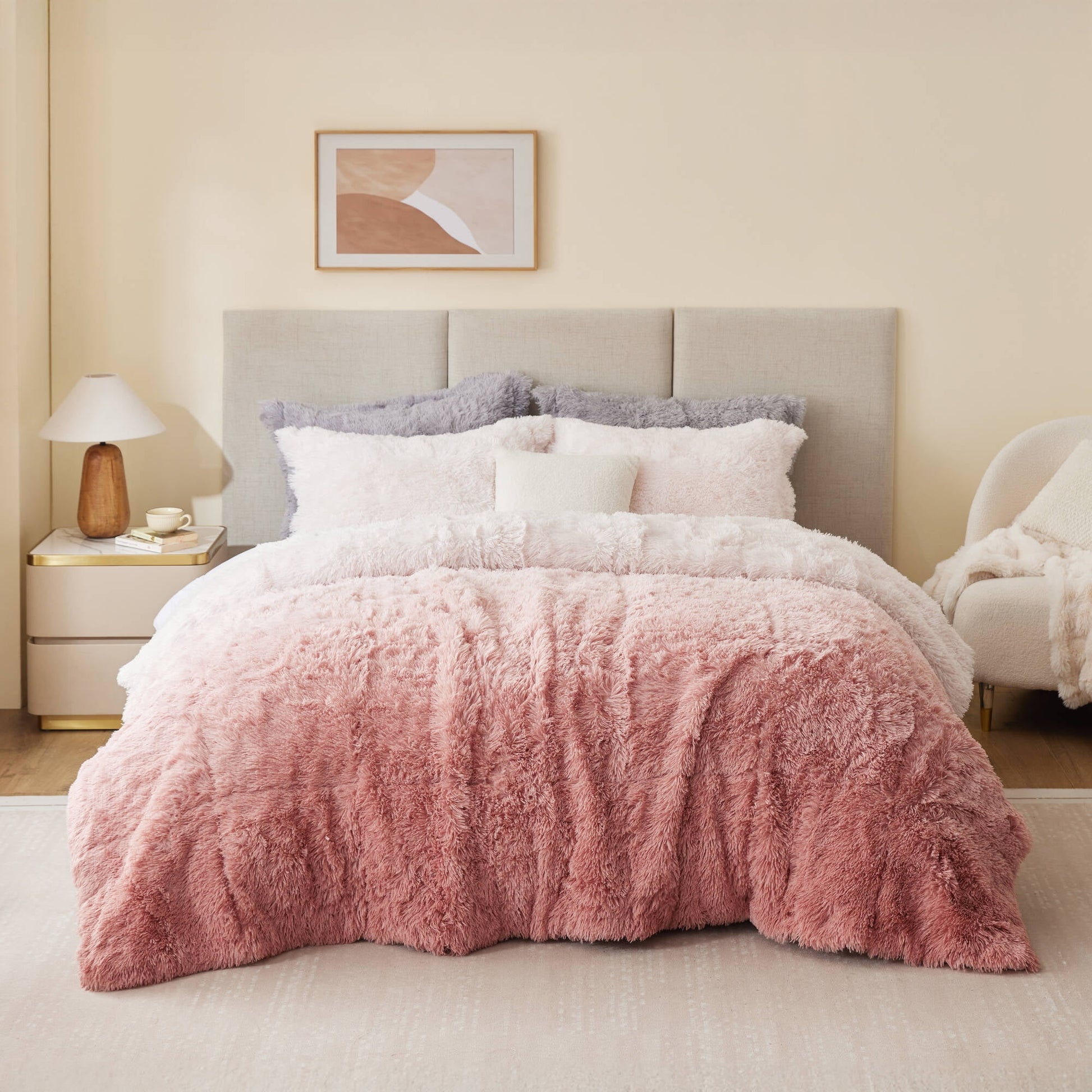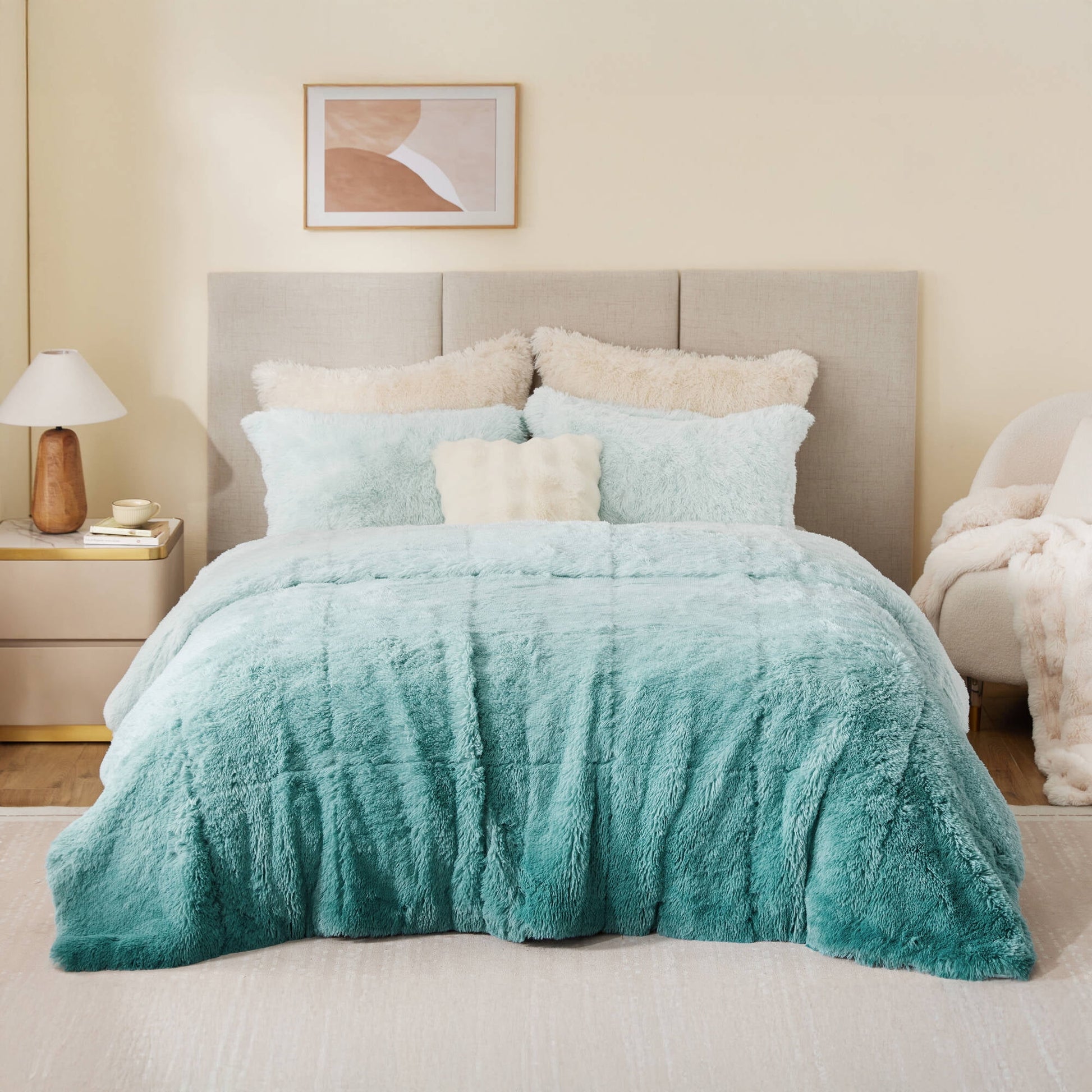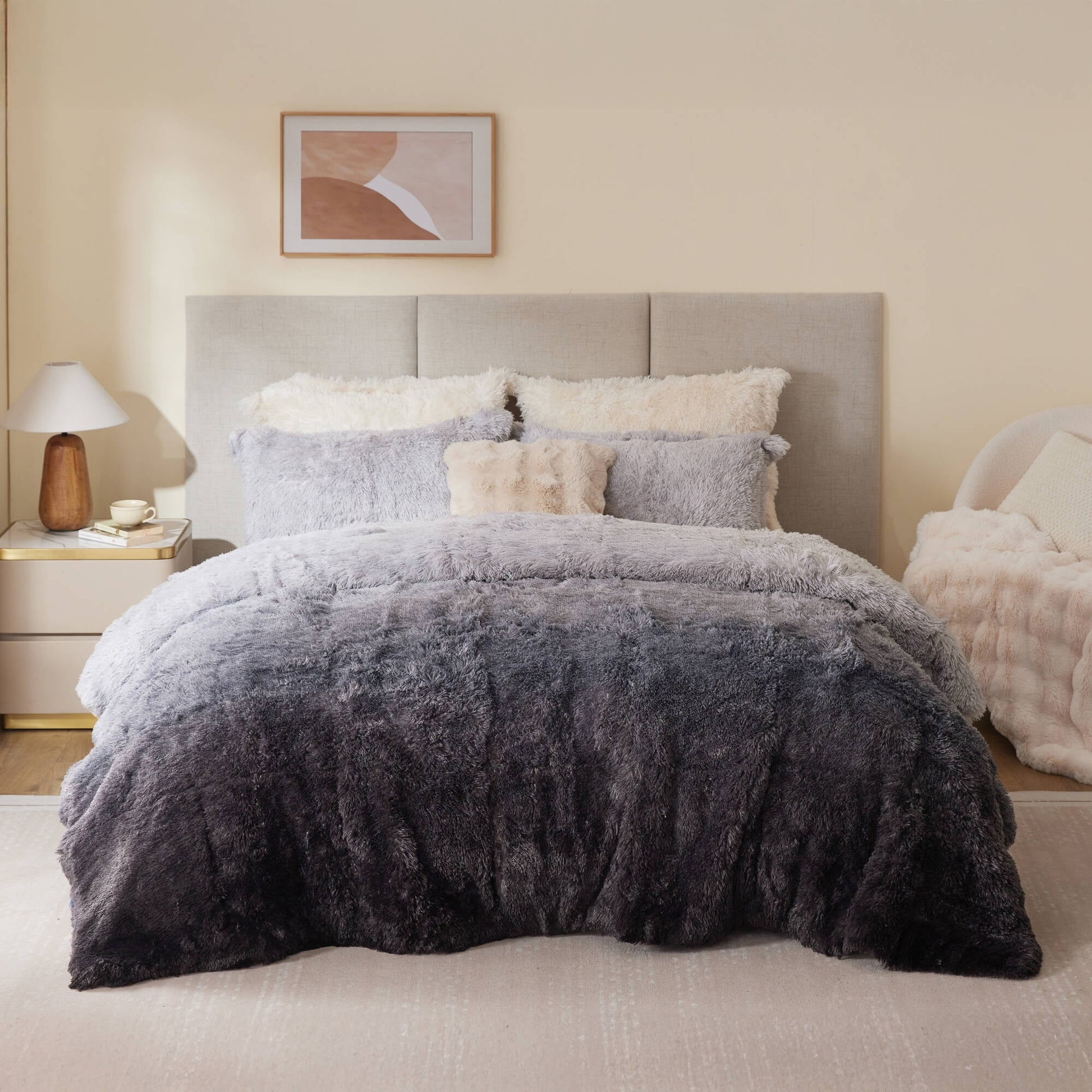 Create a cozy and comfy space with the Ombre Shaggy Faux Fur Comforter Mini Set. This shaggy fur comforter features an ombre design with a soft, warm faux mink reverse, bringing you ultimate warmth and comfort. The set includes matching shams that coordinate with the comforter. The hypoallergenic polyester filling in the comforter contains no allergens and is treated to be dustproof. Machine washable for easy care, this faux fur comforter cradles you in lush comfort.