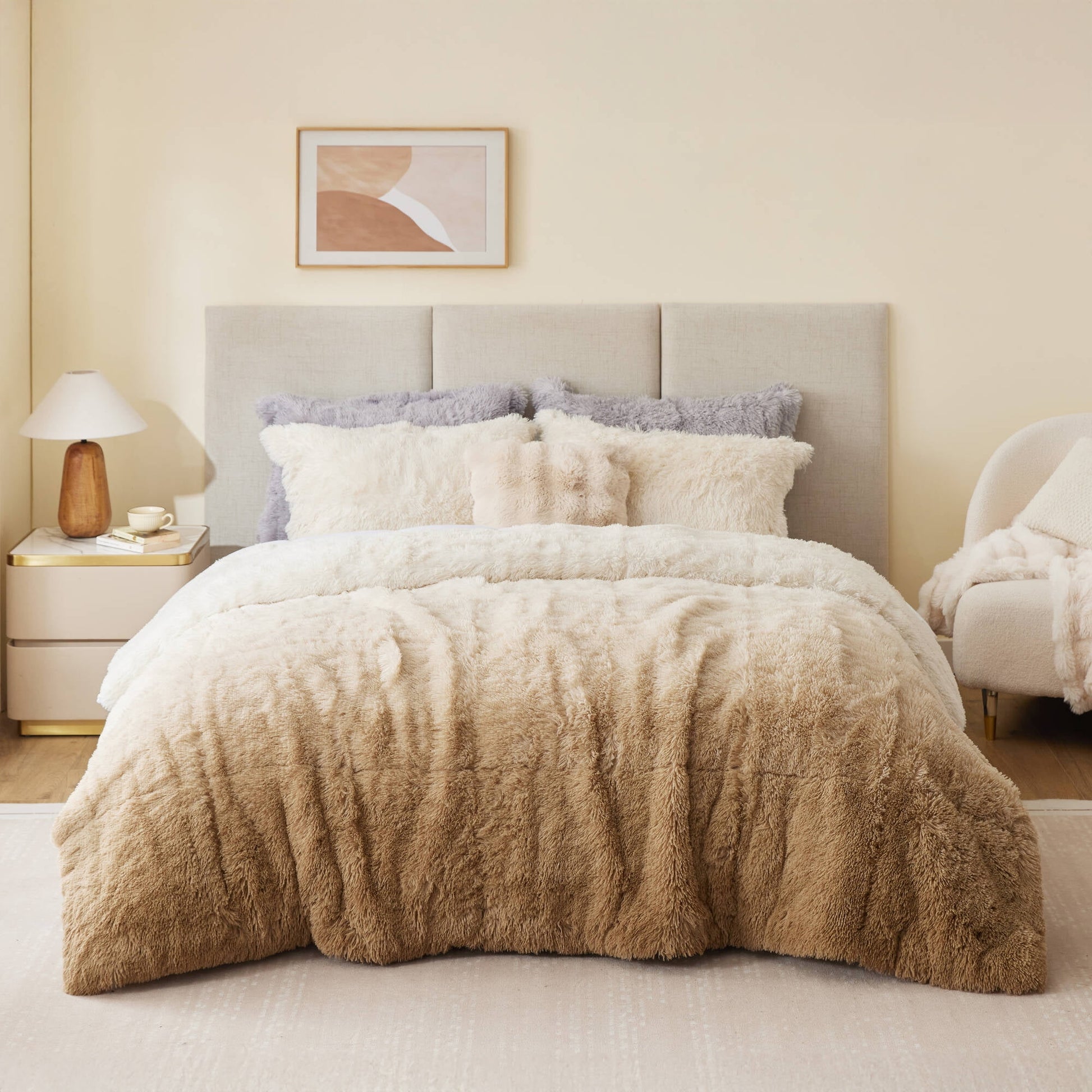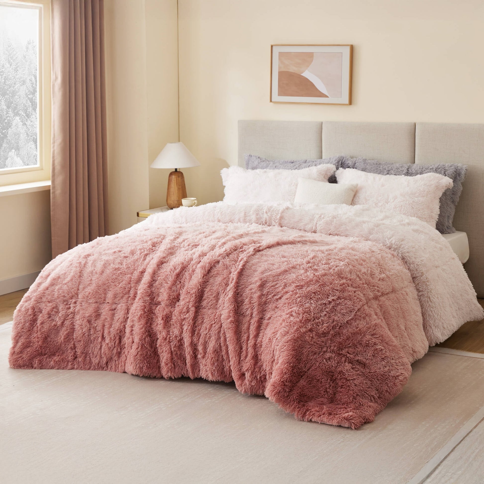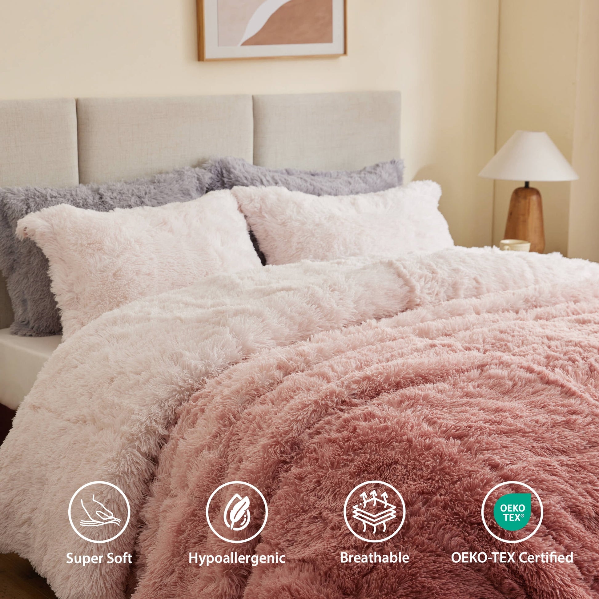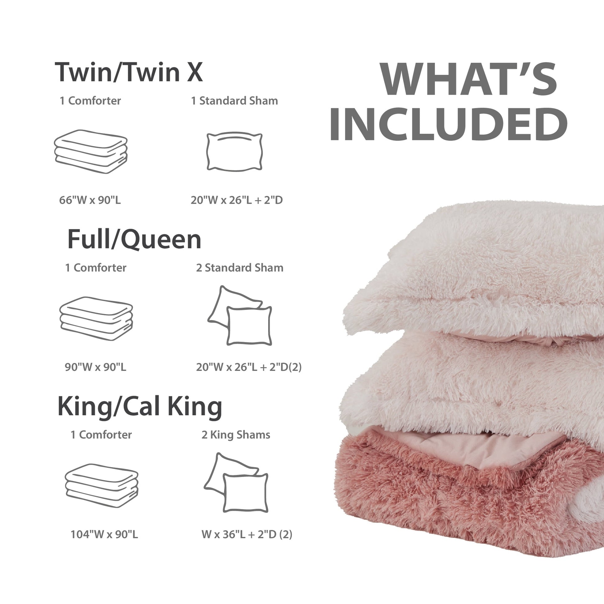 Create a cozy and comfy space with the Ombre Shaggy Faux Fur Comforter Mini Set. This shaggy fur comforter features an ombre design with a soft, warm faux mink reverse, bringing you ultimate warmth and comfort. The set includes matching shams that coordinate with the comforter. The hypoallergenic polyester filling in the comforter contains no allergens and is treated to be dustproof. Machine washable for easy care, this faux fur comforter cradles you in lush comfort.