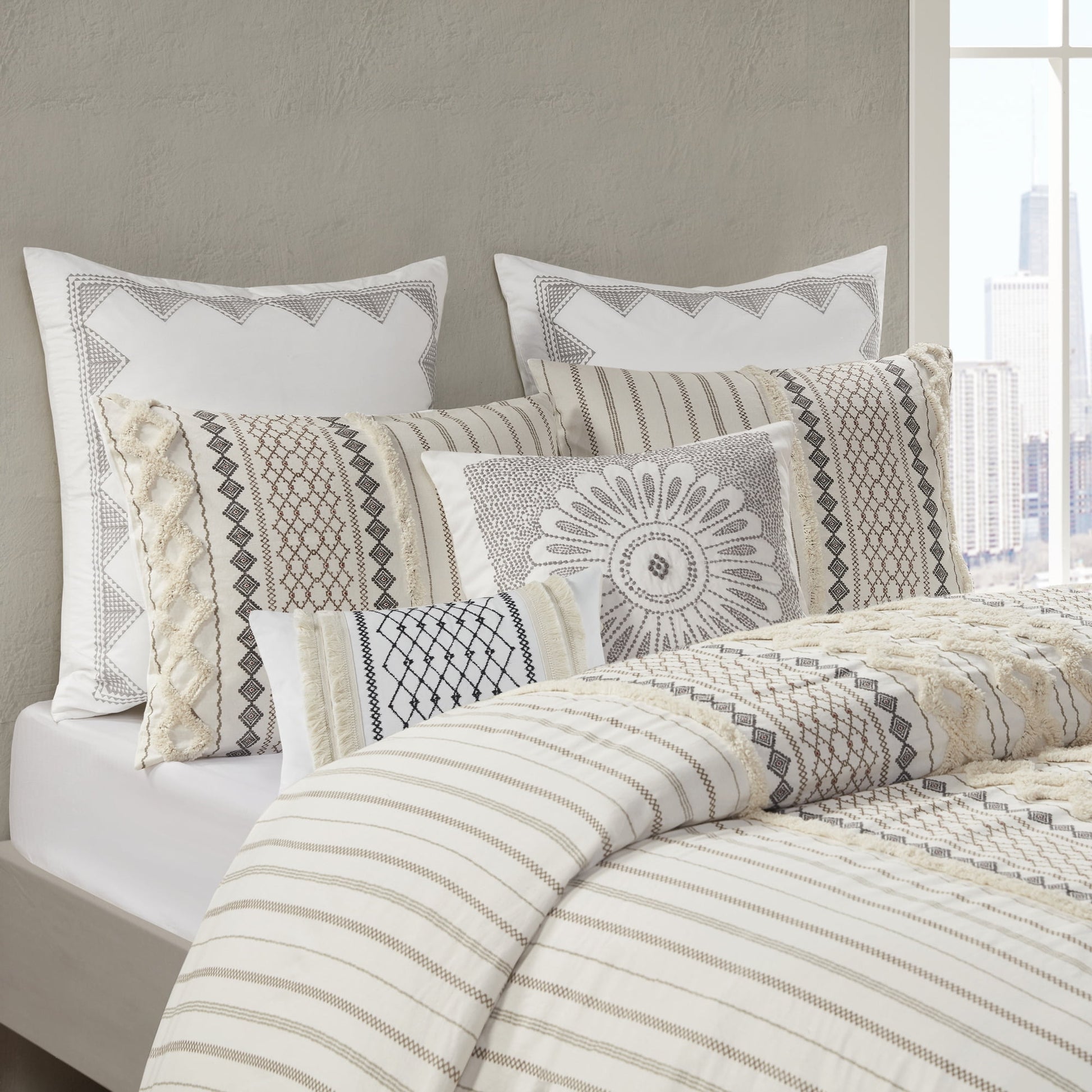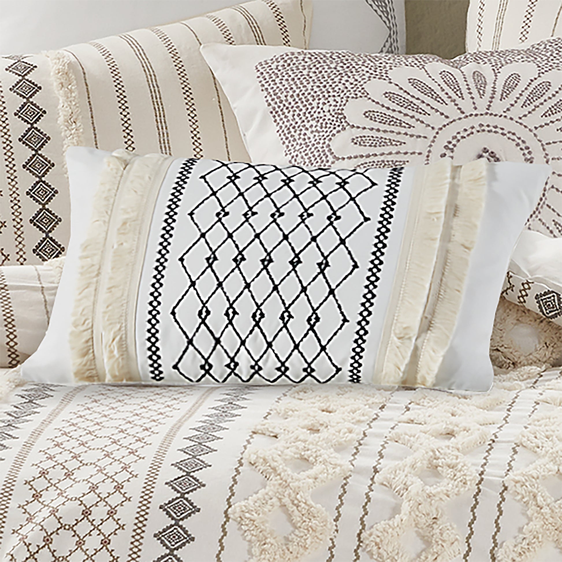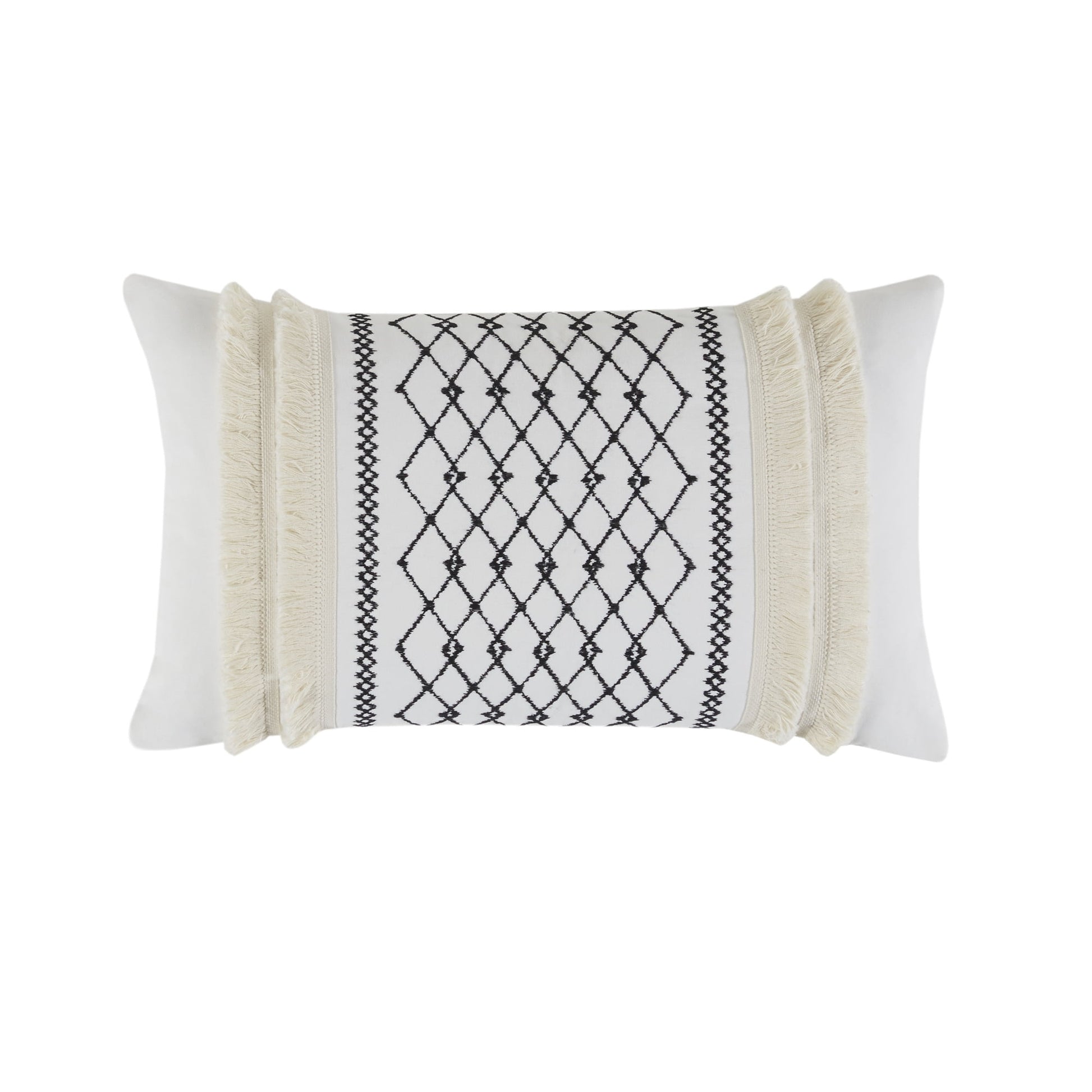 The INK+IVY Bea Embroidered Cotton Oblong Pillow with Tassels brings a charming look to your home decor. Made from 100% cotton canvas, this oblong decorative pillow features an embroidered geometric design in the center and chenille fringes that add dimension to the rich ivory base. Elegant tassels at the corners add a beautiful accent, while a hidden zipper closure secures the ultra-soft filling and creates a clean edge. Place this embroidered cotton oblong pillow on the top of your bed or sofa to give your decor a chic mid-century touch.