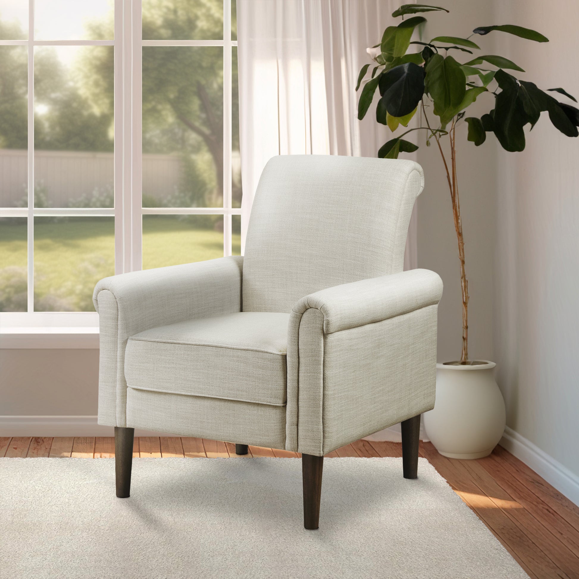 Experience timeless elegance with our Traditional Rolled Arm Accent Chair with Attached Cushion Wood Ivory Armchair. The rolled back and arms, paired with piping details, create a tailored look. The sturdy frame is made with solid wood legs and plywood, and the sinuous spring cushion support with high-density foam ensures comfort that will last. With adjustable levelers and tool-less assembly, this chair is both practical and stylish.