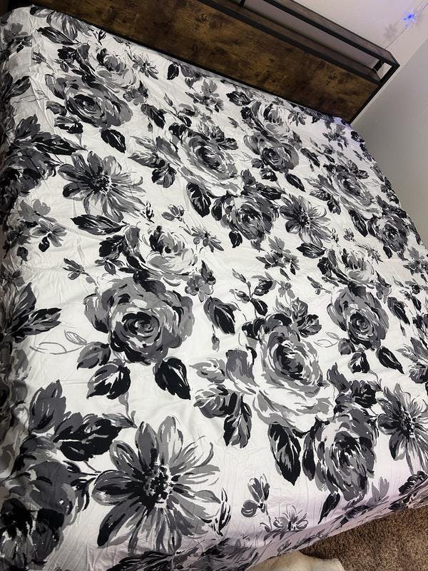 Transform your bedroom with the beautiful contrast of the Floral Print Comforter Set. The ultra-soft microfiber comforter and sham(s) flaunt a floral print in black and white for an elegant appeal. A solid black reverse on the comforter complements the top of the bed with a bold touch. Two decorative pillows with hypoallergenic filling are also included to complete the bedding set. Machine washable for easy care, this floral comforter set adds a stunning transitional look to your bedroom décor. This bedding set uses an antimicrobial treatment that provides built-in freshness protection, reducing the growth of odor causing bacteria to keep fabric lasting longer.