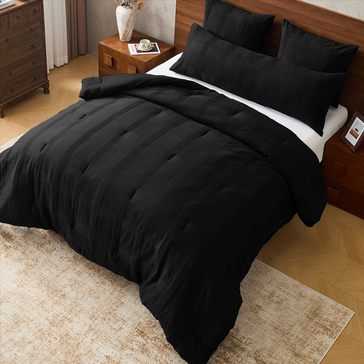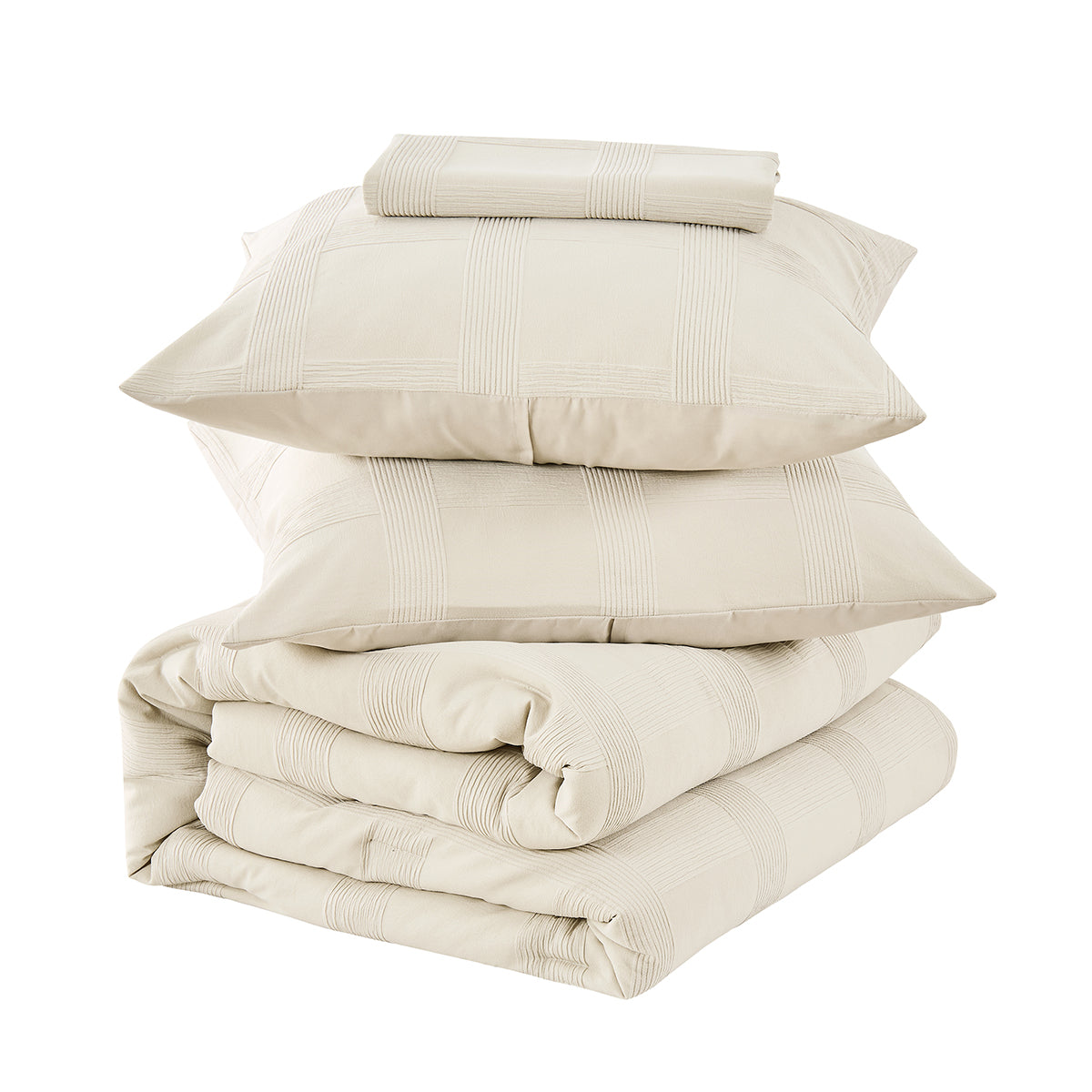 Upgrade your bedroom effortlessly with this Comforter Set. Designed for style and simplicity, this set includes a comforter, coordinating sham, and body pillowcase—each thoughtfully crafted to bring harmony and sophistication to your space. The soft neutral tones paired with subtle woven stripes create a serene, modern look suitable for any décor. Ideal for busy lifestyles, this bedding set is machine washable, quick-drying, and built to maintain its crisp, fresh appearance. Made from high-quality polyester jacquard and Oeko-Tex certified materials, it's both comfortable and safe for all skin types. Transform your bedroom into a calm retreat with this easy, stylish bedding upgrade.