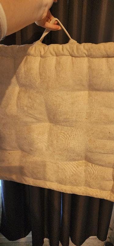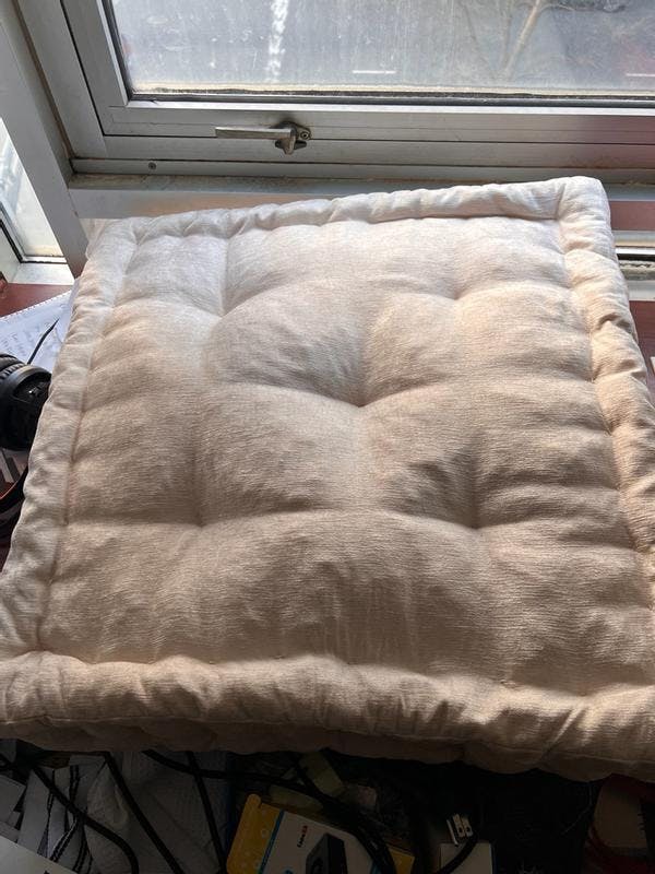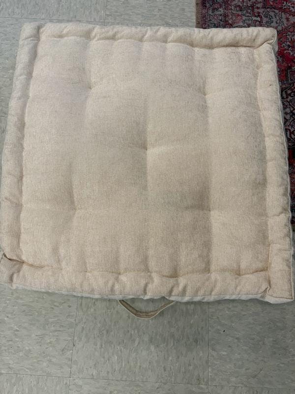 I was excited to get this item because we love to sit on the floor in my house and have pillows just for that reason. So when i received an offer to get it for free in exchange for my honest review i quickly accepted. I thought it would be a bit bigger but although small this thing is incredibly comfortable...it helps take pressure off my low back and is the perfect size for criss cross applesauce. It's basic color almost khaki material so blends in with any decor. When I took it out the packaging I was skeptical but following the instructions for fluffing it helped and it turned into a lovely cushion.