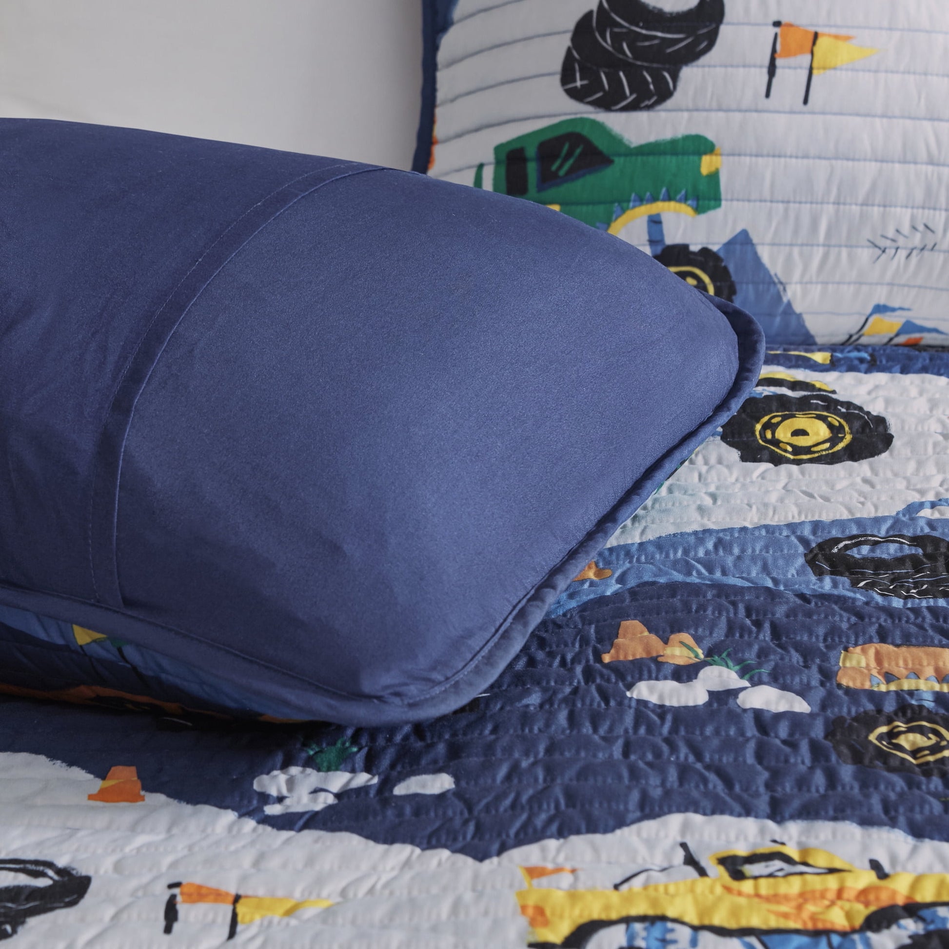 Cruise off to sleep with the Reversible Coverlet Set, a perfect addition to bedding for boy rooms. This fun truck bedding twin set includes a coverlet and matching shams (1 in Twin Sizes) with a truck print motif in green and orange on an ultra-soft blue and gray base fabric. A solid blue reverse complements the top, and an oblong decorative pillow with hypoallergenic filling flaunts an applique truck, completing this boys coverlet set. Prewashed to prevent shrinkage with cotton-rich filling, it's an adorable update to your child's bedroom and is machine washable for easy care.