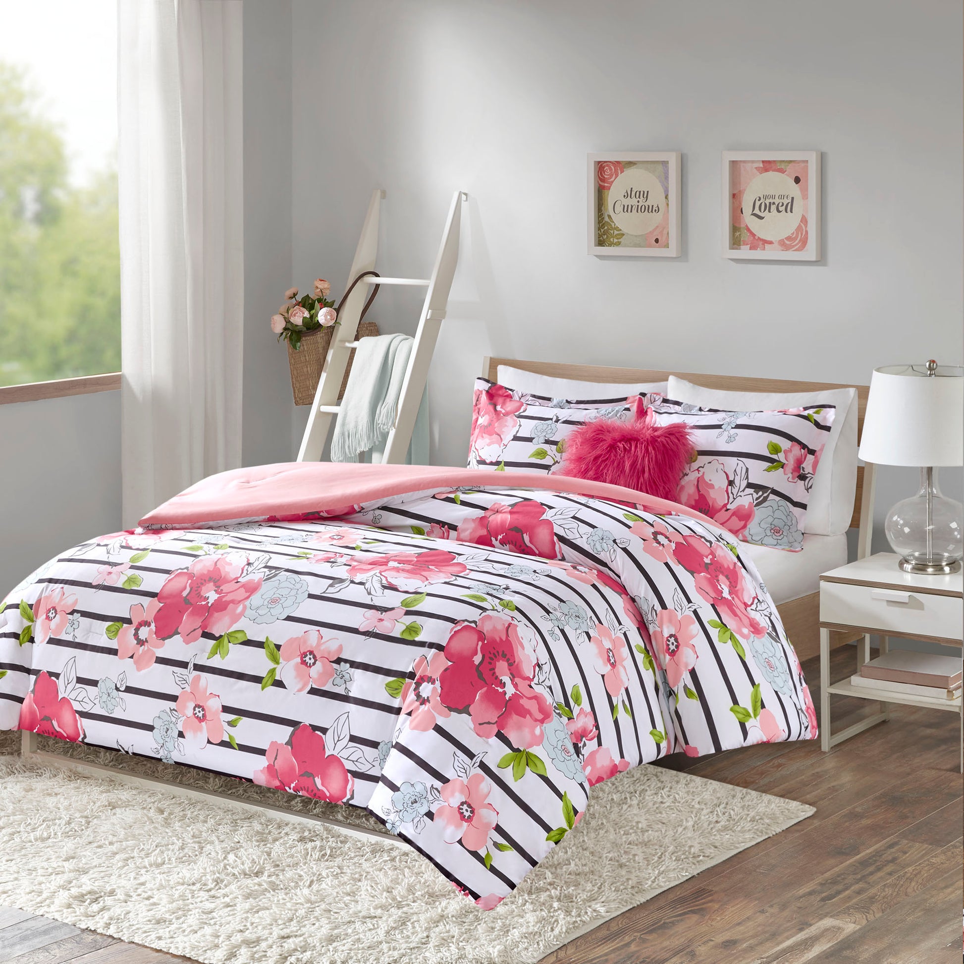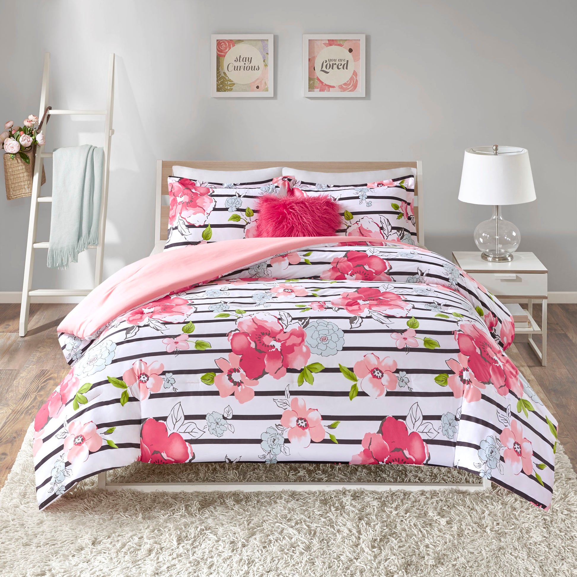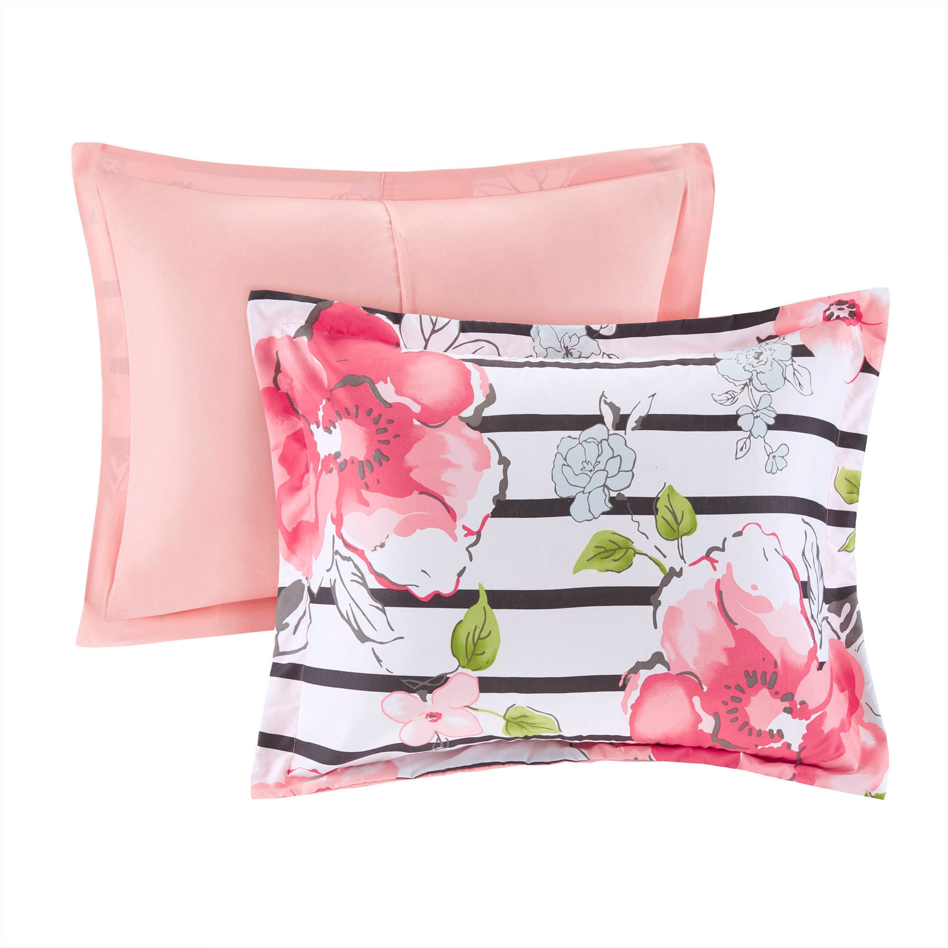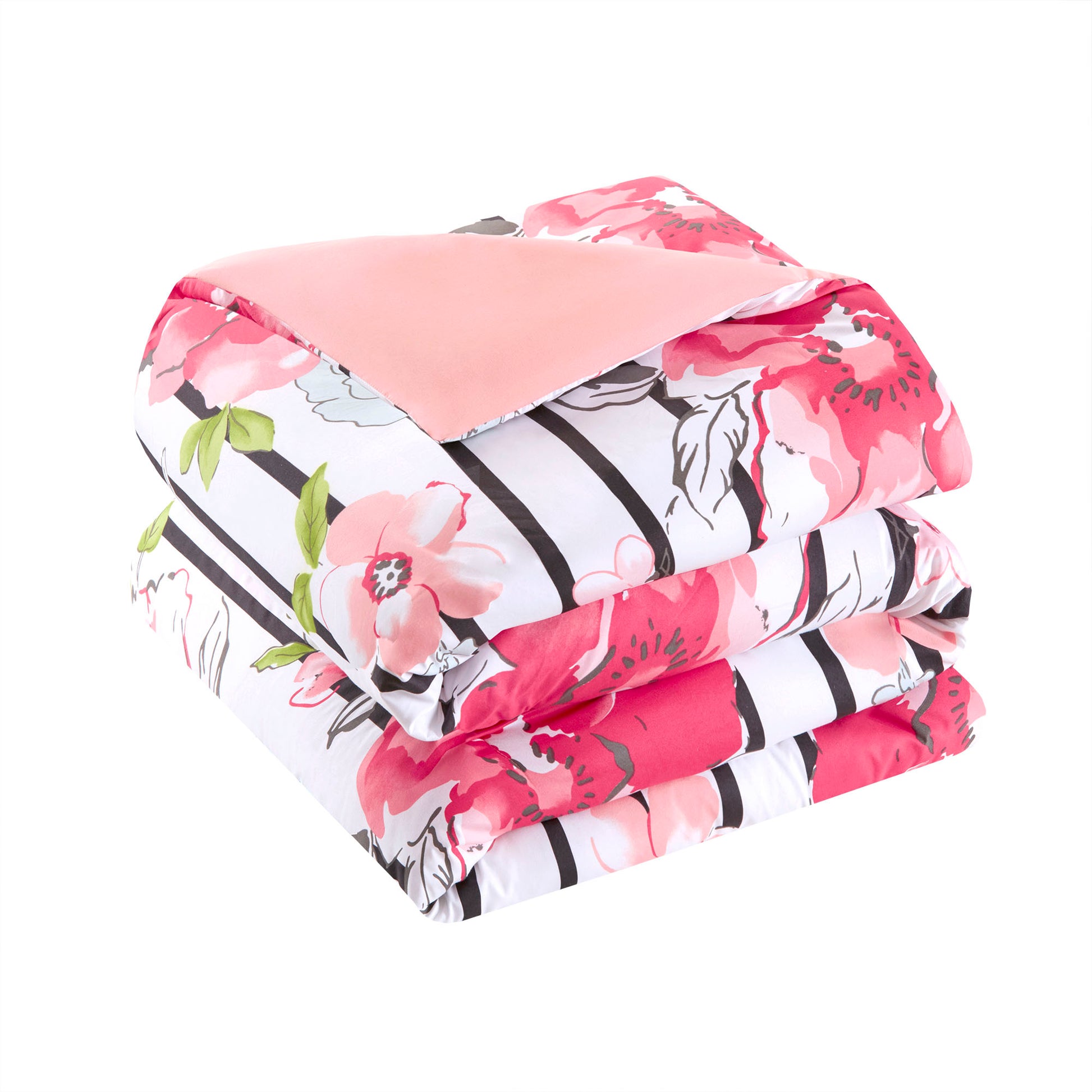 Introducing the Spring Printed Striped Floral Comforter Set, the perfect way to liven up your bedroom. The comforter and sham(s) feature a stylish black and white stripe design with a vibrant pink floral print, adding a pop of color to the ultra-soft microfiber comforter. The solid pink reverse offers a soft touch, and a long faux fur decorative pillow adds a fun and eye-catching accent to the top of the bed. The modern floral and botanical printed comforter boasts bright and vibrant colors, bringing vitality and a mood-lifting atmosphere to your room. This bedding set is a great gift for women, girls, friends, and mothers. Available in Twin/Twin XL and Full/Queen sizes, this machine washable set is easy to care for. Add a charming burst of color to your bedroom decor with this adorable bed set.